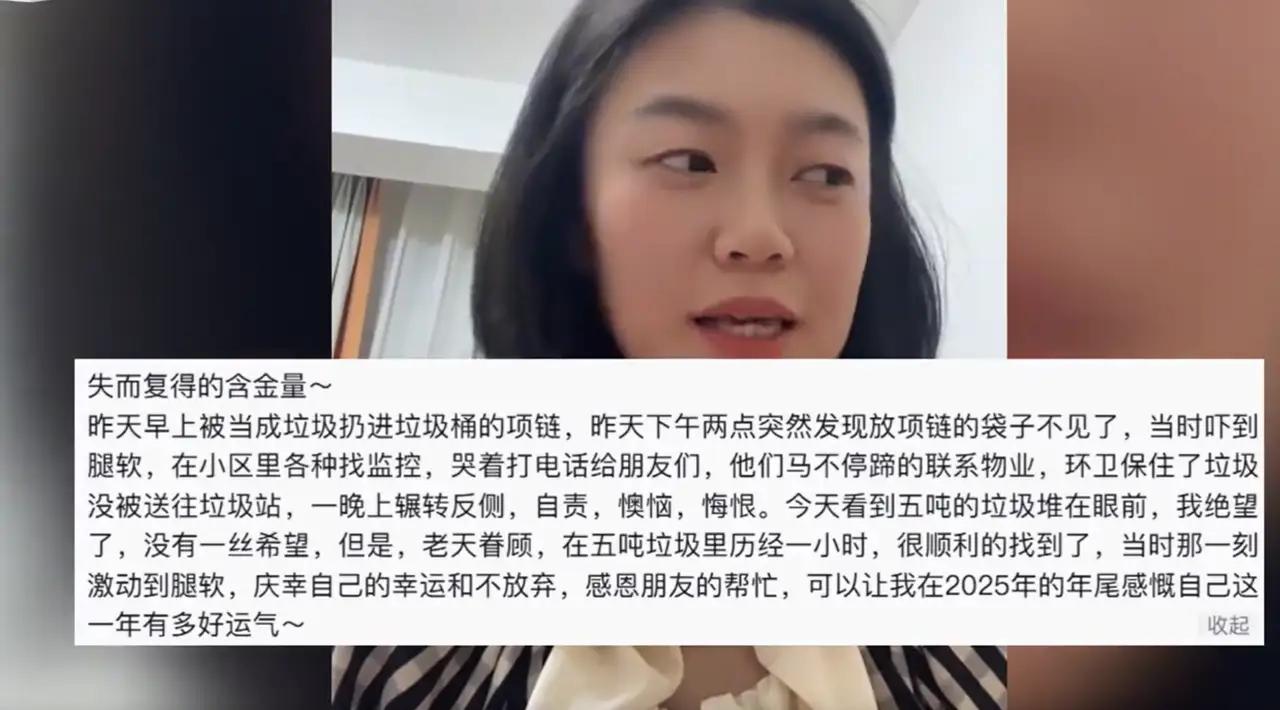 山东烟台,一女子把自己18克的黄金项链随手放到了抽纸袋子里,结果一觉醒来,却发现袋子不见了,当场急的都要哭了,一问老公才知道,竟然是被当做垃圾扔掉了, 于是女子穿着隔离服,直接在垃圾堆里找了起来。 当时,女子准备休息,便将黄金项链放进抽纸外包装袋,转头便忘了此事。次日一觉醒来,女子想起项链想去取用,却发现装着项链的袋子不翼而飞。 她在家中翻箱倒柜,始终不见袋子踪影。急得眼泪直打转,声音都带上了哭腔。情急之下她询问丈夫,才得知丈夫打扫卫生时,误以为这是个空袋子,随手扔进了垃圾桶。 得知真相的女子瞬间慌了神,顾不上抱怨,立刻冲向小区垃圾桶,却发现垃圾早已被清运。她赶忙联系物业,得知垃圾已被运往小区回收站,心中刚燃起的希望又被浇灭。但女子不愿放弃,随后一行人赶往回收站。 眼前的景象让众人倒吸一口凉气:近五吨垃圾堆积如山,散发着刺鼻异味,各类杂物混杂在一起。女子和五位亲友迅速套上简易隔离服,戴上手套,不顾脏乱地钻进垃圾堆开始翻找。灰尘沾满了衣物,碎屑扎得手生疼,他们弯腰弓背,一点点扒拉、分拣,生怕错过那个关键的抽纸袋子。 时间一分一秒过去,每个人的额头都渗出汗水,手指也变得僵硬。就在大家快要失去耐心时,一位亲友突然大喊:“找到了!”众人立刻围拢过来,女子激动得忍不住大喊出声,眼中满是失而复得的狂喜与后怕。 生活中的贵重物品切勿随手乱放,避免因一时疏忽造成不必要的损失。