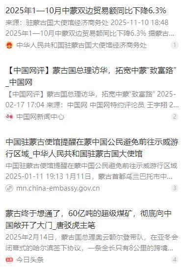 蒙古国乱成一团,反华到底图啥?蒙古国首都乌兰巴托的街头又闹起来了,这回依旧是熟悉的配方:民众的怒火烧向腐败的官员,但拨开这层骚乱的表象,你会发现一个更加拧巴的现实。 麻烦看官老爷们右上角点击一下“关注”,既方便您进行讨论和分享,又能给您带来不一样的参与感,感谢您的支持! 蒙古国首都乌兰巴托的街头又闹起来了,这回依旧是熟悉的配方:民众的怒火烧向腐败的官员,但拨开这层骚乱的表象,你会发现一个更加拧巴的现实。2025 年 4 月起,乌兰巴托苏赫巴托广场的示威游行持续多日,民众本为抗议官员贪腐聚集,却在部分政治力量的刻意操控下,让反华声浪夹杂其中,成了这场骚乱的另类底色。 一边是靠着中国市场赚得盆满钵满,一边却在政治层面喊着 “去中国化” 的口号,蒙古国如今的发展状态,满是这种自相矛盾的反差。作为一个内陆国家,蒙古国的经济命脉几乎牢牢系在中国身上,这份依赖不是嘴上说说,而是实打实的贸易数据摆在眼前。 2025 年 1 到 10 月,中蒙双边贸易额占蒙古国同期外贸总额的 68.7%,依旧是其对外贸易的绝对主力。其中蒙古国对华出口占比更是达到 90%,九成左右的煤炭、铜矿、稀土等核心矿产,最终的销路都是中国,中国市场直接撑起了蒙古国的出口经济。 不只是矿产出口,中国的投资和合作还渗透到蒙古国发展的方方面面。从公路、铁路等基础设施建设,到日常的民生保障领域,中国的合作项目成了当地城市运转和民众生活的重要支撑,就连蒙古国百姓日常用的果蔬、日用品,七成以上都要从中国进口。 就是这样一个经济上离不了中国的国家,却始终摆脱不了反华的杂音,这背后的原因,要从几十年前说起。苏联时期为了实现对蒙古国的控制,刻意切断了它和中国的历史文化联系,还不断向当地灌输 “中国威胁论”,久而久之,便形成了长期的反华心理惯性。 这份被刻意培养的情绪,在蒙古国复杂的国内问题中被不断放大。作为内陆国,蒙古国缺乏对外通商的便捷通道,资源出口只能依赖周边国家。而国内的优质矿产资源又集中在少数利益集团手中,普通民众根本分不到资源发展的红利,社会贫富差距越拉越大。 年轻人失业率居高不下,贫困人口占比约三分之一,百姓的生活难有盼头,社会矛盾便不断积累。而部分政治势力和利益集团,不愿直面自身的治理问题,反而将国内的一切矛盾都甩锅给中国,用煽动反华情绪的方式转移民众视线,这也让反华声浪一次次被挑起。 除了经济和政治的问题,蒙古国的生态困境也早已迫在眉睫,而这背后,依旧能看到其政策摇摆的弊端。目前蒙古国约 77% 的土地面积遭受不同程度的荒漠化,沙化区域还在逐年扩张,沙尘暴频发成了常态,生态问题已经威胁到民众的基本生存。 面对严峻的沙化问题,中国曾主动伸出援手,为蒙古国提供先进的治沙技术,还送去了 282 万株树苗,希望能帮其改善生态。可因为蒙古国国内的政策摇摆不定,缺乏长期的执行规划,这些治沙合作项目的落地率不足 40%,大量的努力最终都打了水漂。 令人费解的是,蒙古国不愿踏踏实实和中国开展生态合作,反而把钱花在一些毫无实际意义的象征性政策上。2024 年底,蒙古国总统签署总统令,耗资 3600 万美元在中蒙边境东戈壁省修建 130 公里的铁丝网,官方理由是防止牲畜跨境,实则毫无必要。 要知道,2025 年上半年蒙古国的外汇储备仅有 15.07 亿美元,3600 万美元相当于其近 2.4% 的外汇储备,这笔钱本可以用来改善民生、发展产业,却被花在边境的铁丝网上。而这道铁丝网不仅没解决任何问题,还直接影响了中蒙边境的贸易通道,增加了两国的贸易成本。 中蒙边境的甘其毛都、策克等口岸,是蒙古国对华贸易的核心通道,铁丝网的修建让口岸的货车运输被迫绕行,不仅耽误时间,还增加了燃油和车辆磨损成本。这些成本最终都会转嫁到蒙古国百姓身上,让本就不富裕的生活雪上加霜,可谓是搬起石头砸自己的脚。 无论是经济发展还是生态治理,蒙古国的所有问题,根源都在自身,而非中国。可部分势力始终不愿正视问题,反而被反华情绪裹挟,一次次拒绝和中国的务实合作,这也让蒙古国的发展陷入了恶性循环,未来的危机早已显现。 如果蒙古国继续这样下去,未来 20 年必将面临多重发展危机。失去中国这个稳定的出口市场,其矿产资源出口将遭遇严重受阻,本就单一的经济结构会彻底崩塌,经济衰退在所难免。而生态问题得不到有效治理,沙化持续扩张,会让民众的生存空间不断被挤压。 更严重的是,国内的社会矛盾会因为经济衰退和生态恶化进一步激化,贪腐问题得不到解决,资源收益无法公平分配,民众的不满情绪会持续爆发,乌兰巴托街头的骚乱只会越来越多,国家的稳定和发展更是无从谈起。