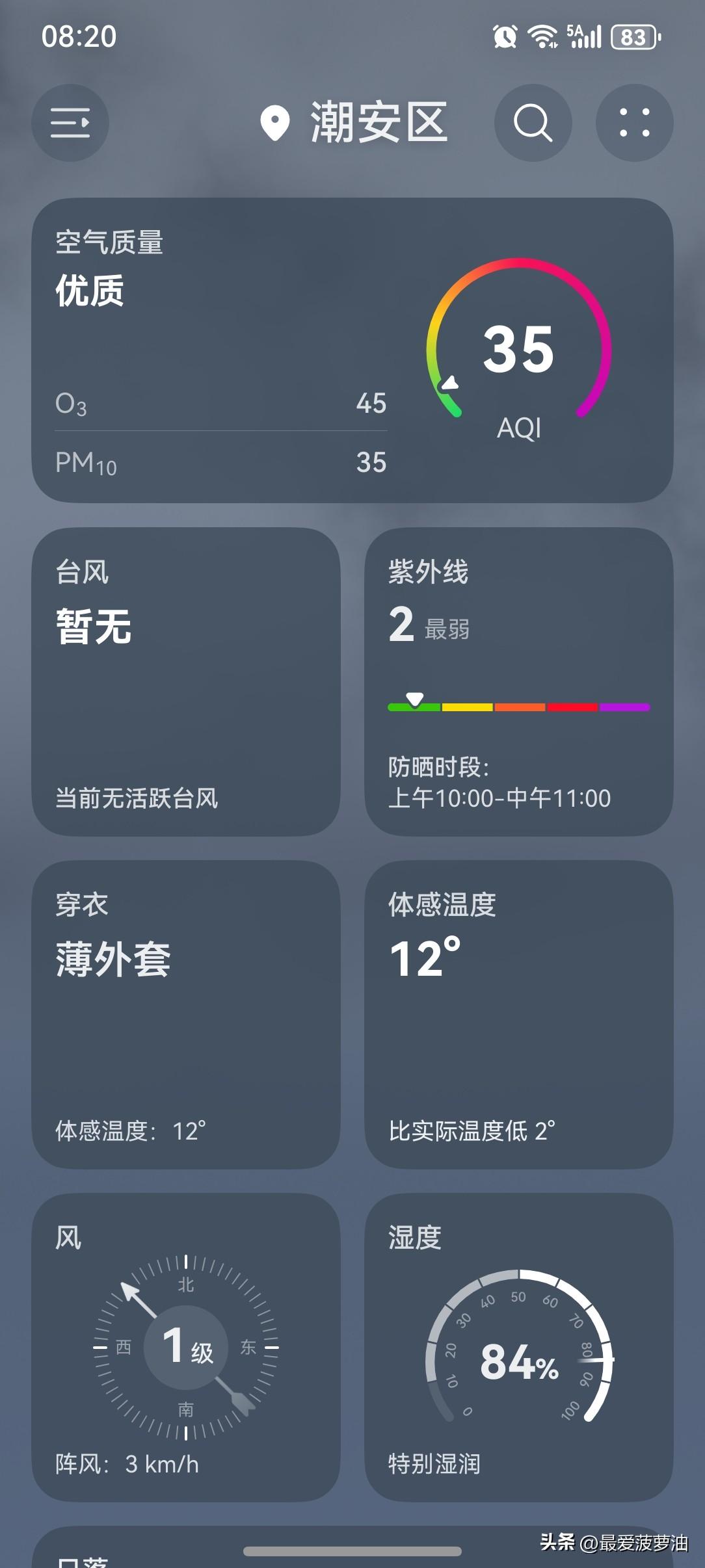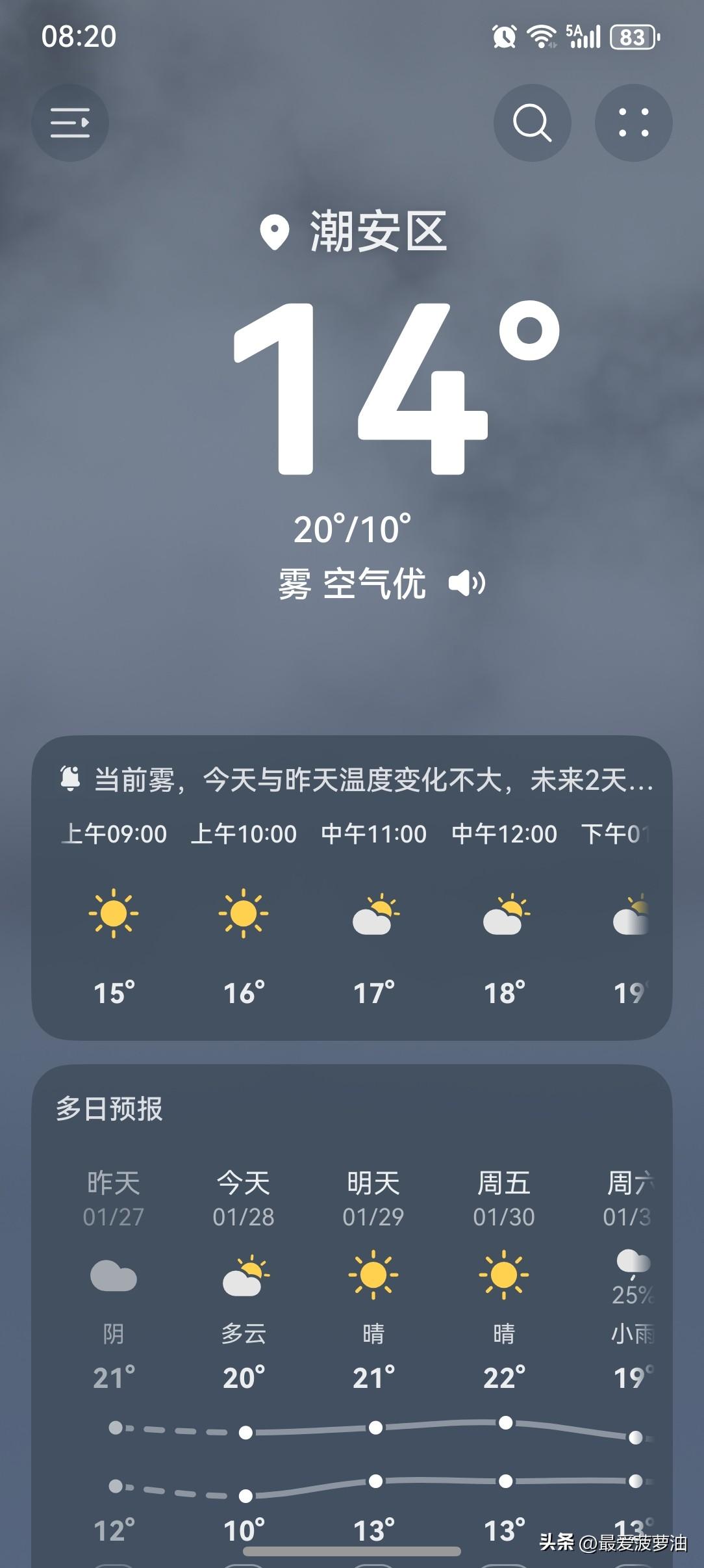 广东本周多股冷空气接力来袭!降温+降雨!广东或迎湿冷魔法攻击!网友纷纷调侃:冷就冷吧,别回南天就行! 受弱冷空气影响,今天(28日),广东日平均气温将小幅下降2~4℃;29日~30日白天,全省开启增温增湿模式,部分市县会出现弱降水,雨雾天气也会愈发明显;展望30日夜间~31日,新一股冷空气再度南下,广东又将迎来降温降雨过程。 今天(28日),潮州喜提一个多云转晴天气,气温10~20℃,此刻气温14℃,体感温度12℃。 今天的气温比昨天有所下降!从昨天下午开始开始,突然就起风了,气温就这么华丽丽地下降了!弱冷空气终究还是来了!弱了弱了点,但气温还是下降了。温度下降,再吹吹风,体感更冷。 一起来看看今天的天空吧!云量明显又增多了,看不到一点阳光。昨天早上好歹还能从云层缝隙里看到一点点阳光,虽然不多,但感觉好很多。今天的就不一样啦!云层厚重,把阳光全遮住了,半点光都没有。 没有阳光的加持,气温也下降了,小伙伴们!防寒保暖措施还是要做好啊! 今天的天气整体还是好的!虽然气温下降了,但还不算太冷;天色虽然阴沉,但没有下雨已经算好了。 今天的天气,依然值得拥有一个好评吧! 如此天气!元芳,你怎么看? [捂脸][我想静静][大笑][笑哭][捂脸][我想静静][大笑][笑哭]