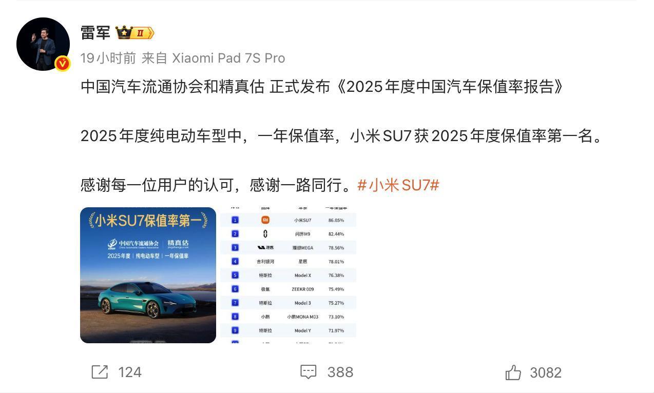 哈哈哈哈哈哈,国汽车流通协会和精真估发布的《2025年度中国汽车保值率报告》显示,小米SU7是纯电车型一年保值率的第一名!保值率有86.05。 不知道有没有车主去二手市场打听打听行情,看看这个保值率是不是实至名归? 另外,从这份报告可以看到,问界M9和理想MEGA分列二到三名,保值率为82.44%和78.56%