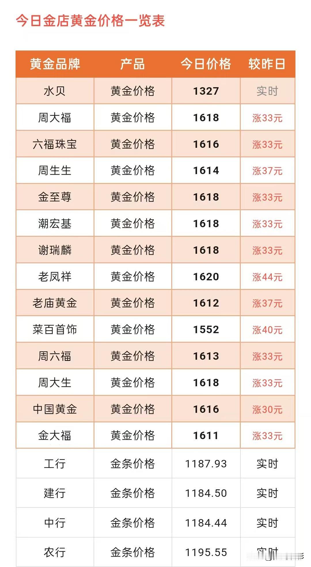 今日金价 金价太疯狂了!各大黄金门店金饰品价格再次迎来大涨! 那么,现在来看看,今天各大品牌黄金门店金饰品价格零售价卖到多少钱一克了? 周大福黄金价格1618元/克,六福珠宝黄金价格1616元/克,周生生黄金价格1614元/克,老凤祥黄金价格1620元/克,老庙黄金黄金价格1612元/克,菜百首饰黄金价格1552元/克。 同昨天各大品牌黄金门店金饰品价格报价相比较。 今天,所有黄金门店金饰品价格又迎来一次整体大涨。 周大福、六福珠宝、金至尊、潮宏基,谢瑞麟,周六福、周大生、金大福各上涨了33元/克,周生生、老庙黄金各上涨了37元/克,中国黄金上涨了30元/克。 其中,菜百首饰上涨了40元/克,老凤祥44元/克。 今日黄金首饰价格每克在1313元到1618元区间(工费另计)银行金条价格每克1184元,白银价格28.4元。 根据黄金价格网消息: 2026年1月28日,在美元大跌以及避险需求等支撑下,国际金价延续昨日涨势,在隔夜暴涨170美元之后,今日又涨了50美元,现货黄金首次升破5200美元关口,并攀升至5230美元上方,再次刷新历史新高。 不到一个月时间,黄金价格就涨了900美元,涨幅超20%。 与此同时,国内基础金价站上1170元上方,原本想着金价要达到1200元还需要点时间,结果是1月就即将达到了。 白银、铂金和钯金等集体上涨。 对于本轮黄金价格的大幅上涨,独立财经评论员赵欢向21快讯记者分析,各国央行的战略性资产配置需求是本轮黄金上涨的核心支撑。 此外,美联储处在降息周期,意味着持有美元资产的吸引力下降,而黄金作为“无利息资产”的机会成本变低。 另外,东方金诚研究发展部高级副总监瞿瑞、白雪则向记者指出,近期金价暴涨还与地缘政治风险反复密切相关。 瞿瑞、白雪认为,尽管美欧围绕格陵兰岛的争端有所降温,但特朗普威胁对抛售美资产的欧洲实施“重大报复行动”,“短期地缘风险或持续反复,格陵兰岛问题未完全解决,伊朗局势可能添新变数,市场谨慎情绪推高黄金需求。” 买金不踩坑: 1: 不必执着大品牌。足金首饰不一定非选大品牌,只要是足金小品牌或普通金店也可以,款式差异不大,还能省不少钱,毕竟大品牌金价和工费偏高。 2: 认准足金标识。买的时候别只看款式,一定要看钢印标有AU 999、G999和足金999的才是足金指标,不用追求4个9、5个9的纯度,回收时和3个九的价格一样。 3: 按克购买更划算。黄金要按克卖,别买一口价,单价高,后续货款只能换一口价款式,可能还要补钱,再优惠也不划算。 4: 慎选带附加饰品的款式。带玉石、珍珠、钻石的黄金款式尽量不买,这些附加饰品容易掉且不值钱,金价可能拉高,专坑不懂行的。 另外,耳钉选弯针不选直针,项链选M扣不选弹簧扣,手镯不选搭扣款和镂空开口款,这些非足金部分也会按足金计价。 5: 提前了解实时金价,上网查一下黄金走势,各品牌和银行的当日金价,做到心里有底。 最后,金店可以砍价,店员可能有内部优惠或员工折扣,你得主动提出要求,不然他们不会主动说,毕竟多买多赚。 记住这几点,买黄金首饰就不会吃亏。 最后分享个黄金首饰日常保养的小常识: 1:存放,黄金贵金属,要避免与其他珠宝首饰相互摩擦,碰撞,易变形,磕碰。 2:不能,避免接触化学物品,香水,化妆品,洗涤剂等,以免影响光泽。 3:清洁,使用温和的肥皂水或者专业的珠宝清洁剂轻轻擦拭。 4:轻拿,黄金软,硬金脆,轻拿轻放,防止拉扯,挤压,避免变形。 5:要取,适当的取下,尤其在体力运动或者洗澡时,防止甩掉,滑掉,最好将首饰取下。 金价有波动,以上金价仅供参考,结算以商家所报金价为准! 购买黄金有风险,投资需谨慎,不要盲目跟风! 黄金售卖价格 黄金金店价格 黄金一克720 足金金饰价格 黄金价格680 金饰价 金饰克价