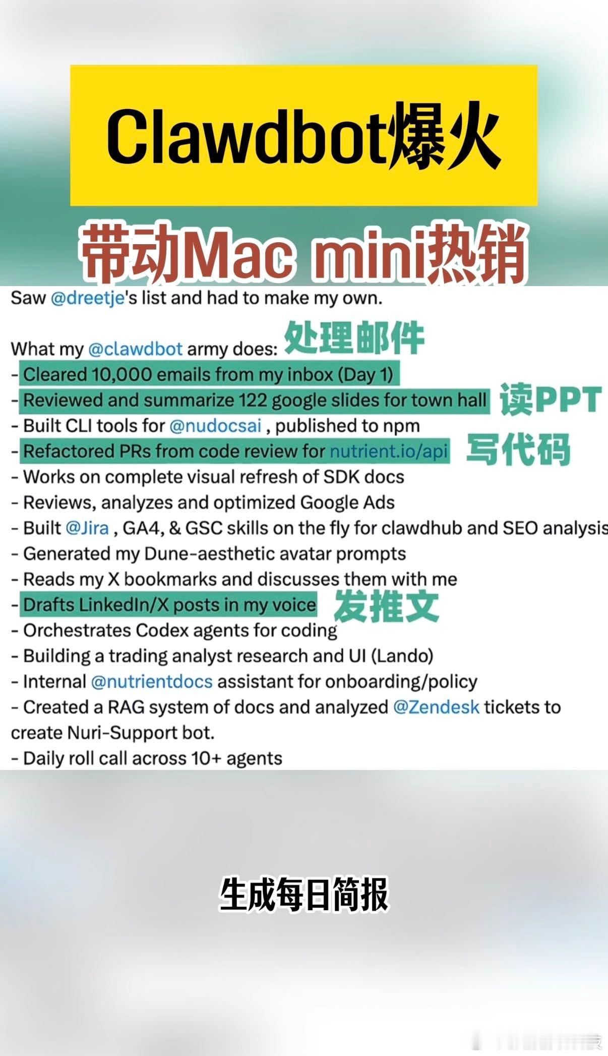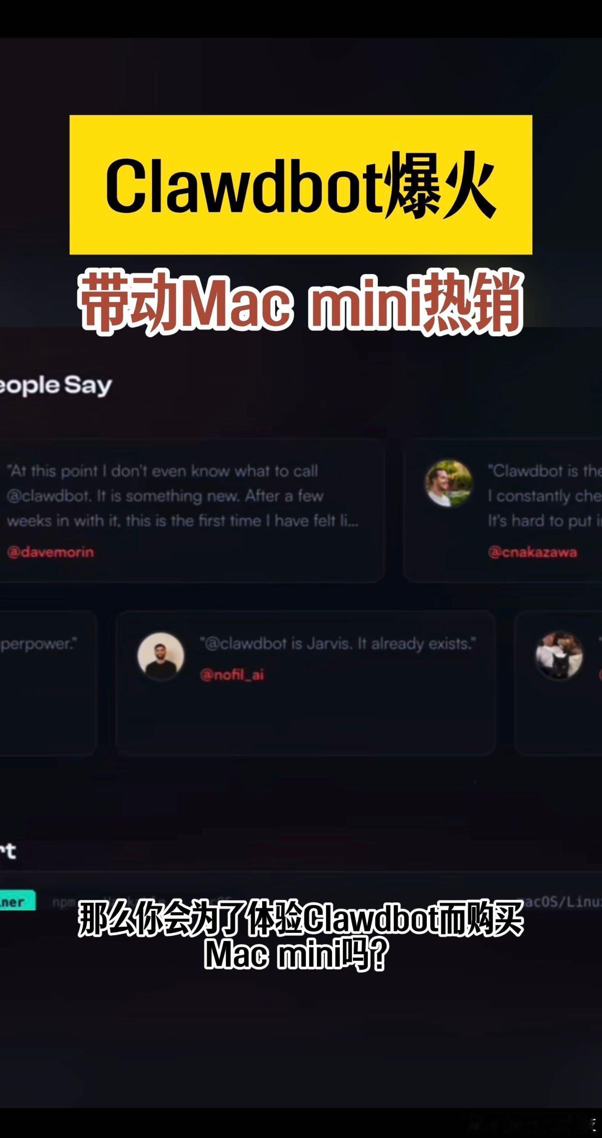 苹果:这次我真的会谢!Clawdbot爆火直接带飞了Macmini。原本不算热门的小主机,现在成了AI部署的首选,部署也简单,手机发个指令AI就开工。最绝的是现在还有国补15%,到手低至3145元,想尝鲜AI智能体的朋友们可以不用犹豫!都给我冲冲冲!Macmini成交量增长超10倍 Clawdbot爆火带动Macmini热销