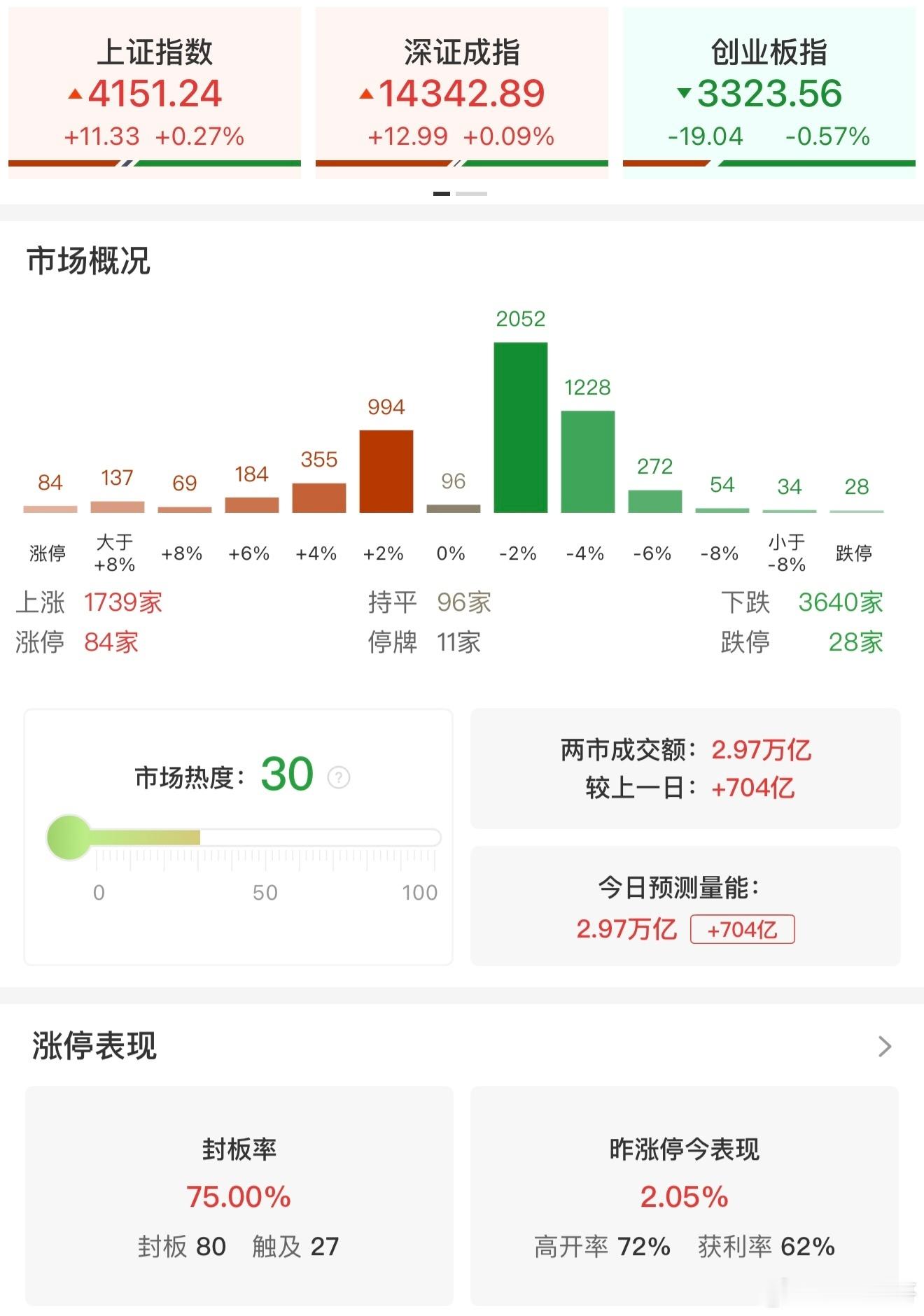 a股【收评:创业板指高开低走跌0.57% 资源股掀起涨停潮】1月28日电,沪指、深成指冲高回落,创业板指高开低走,盘中一度跌超1%。沪深两市成交额2.97万亿,较上一个交易日放量704亿。盘面上,全市场超3600只个股下跌。从板块来看,资源股全天领涨,贵金属、油气、电解铝方向轮番爆发,中国黄金4连板,湖南黄金3连板,中曼石油、晓程科技3天2板,四川黄金10天6板,招金黄金8天5板,石化油服、准油股份涨停,中国铝业涨停创16年新高。分散染料概念集体走高,浙江龙盛、闰土股份、亚邦股份涨停。存储芯片概念表现活跃,中微半导触及20CM涨停,气派科技20CM涨停。下跌方面,医药医疗、光伏等板块跌幅居前。其中医药医疗概念走弱,百普赛斯、必贝特跌超10%,恒瑞医药11连阴。截至收盘,沪指涨0.27%,深成指涨0.09%,创业板指跌0.57%。
