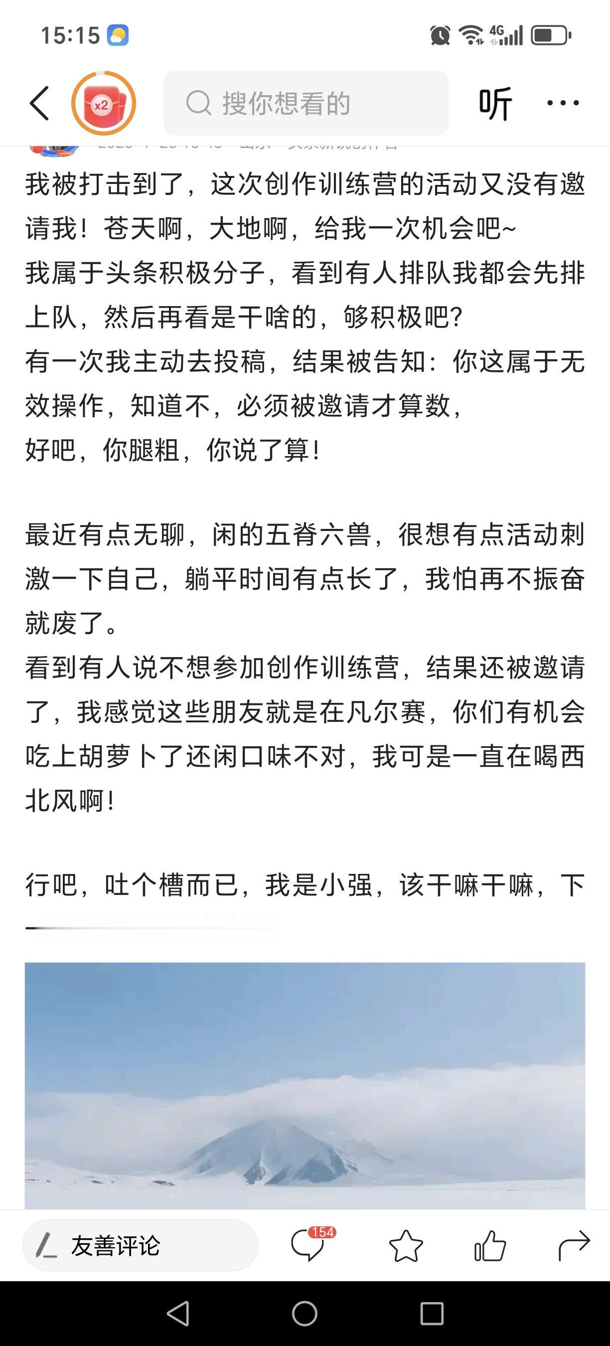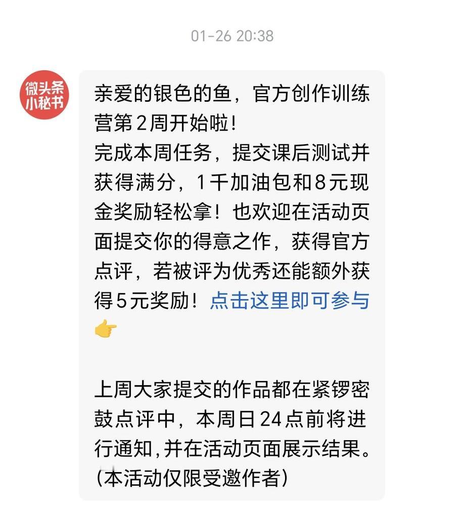 刚刚看了一篇吐槽没被创作训练营邀请的文章。作者说有被打击到,还请苍天和大地给他一次机会。这也太夸张了吧? 虽然我也是第一次被创作训练营邀请,确实有点懵,但更多的还是一些小惊喜。但是首战不理想,现在有些兴致缺缺。 第一周的时候,写了几篇短文,阅读量少得可怜,都犹如石沉大海,一点浪花都没激起,搞得我都怀疑自己了。 虽然第二周已开启,今天是第三天,这却是我写的第一篇,进度确实有些慢。上周的答题环节非常顺利,一次过满分。这周的至今我还未去看过。 创作这事儿,怎么说呢?实力与运气并存吧!创作训练营也不是唯一的提升途径,网上也有很多免费的学习资源。要是有真本事,即便没被训练营邀请,自己也能闯出一片天,机会自然也就自己找上门了。大家觉得我说的对吗?