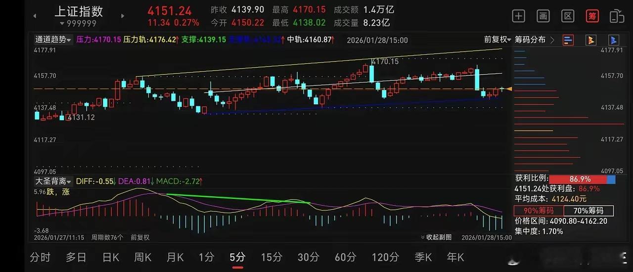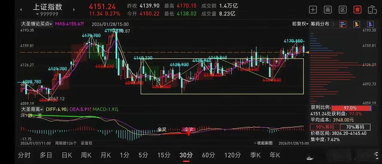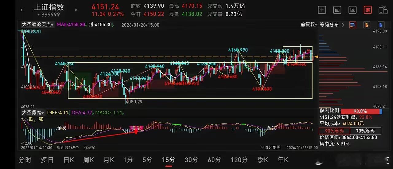 大盘目前稳住4140点以上了,这还是证券压盘的情况下,如果证券不压盘,早突破了4200点。明天支撑4140点,冲击4185点左右,如果证券发力,那么就可以突破4190点了,现在村里故意控制指数节奏,其实好事,这样给个股补涨留出时间,等个股轮番补涨之后,证券启动,再拉一波指数突破4200点,那么年前很可能摸摸4300点,所以,能不能摆脱4190点,关键看证券心情,银行目前也是压制节奏的工具。请看下图,15-30分钟,非常明显的箱体区间,突破4140点,二次回调,再次突破4140点,目前在4140-4170暂时形成一个上涨中枢结构,所以,只要不破4140点就是突破有效,蓄势待发,等待证券主力突破4160点。目前,就是个股的机会,指数暂时问题不大,记住4140点,如果破了4140点不能拉回来,那就注意风险了。今天证券冲高回落,属于试盘了,毕竟跌下来,套牢盘很多,所以,需要反复揉搓,然后一飞冲天,高攀不起。很多人已经对证券失去了耐心和信心,涨是一定的,只是时间契机,就看谁熬的住了。个人观点仅供参考!