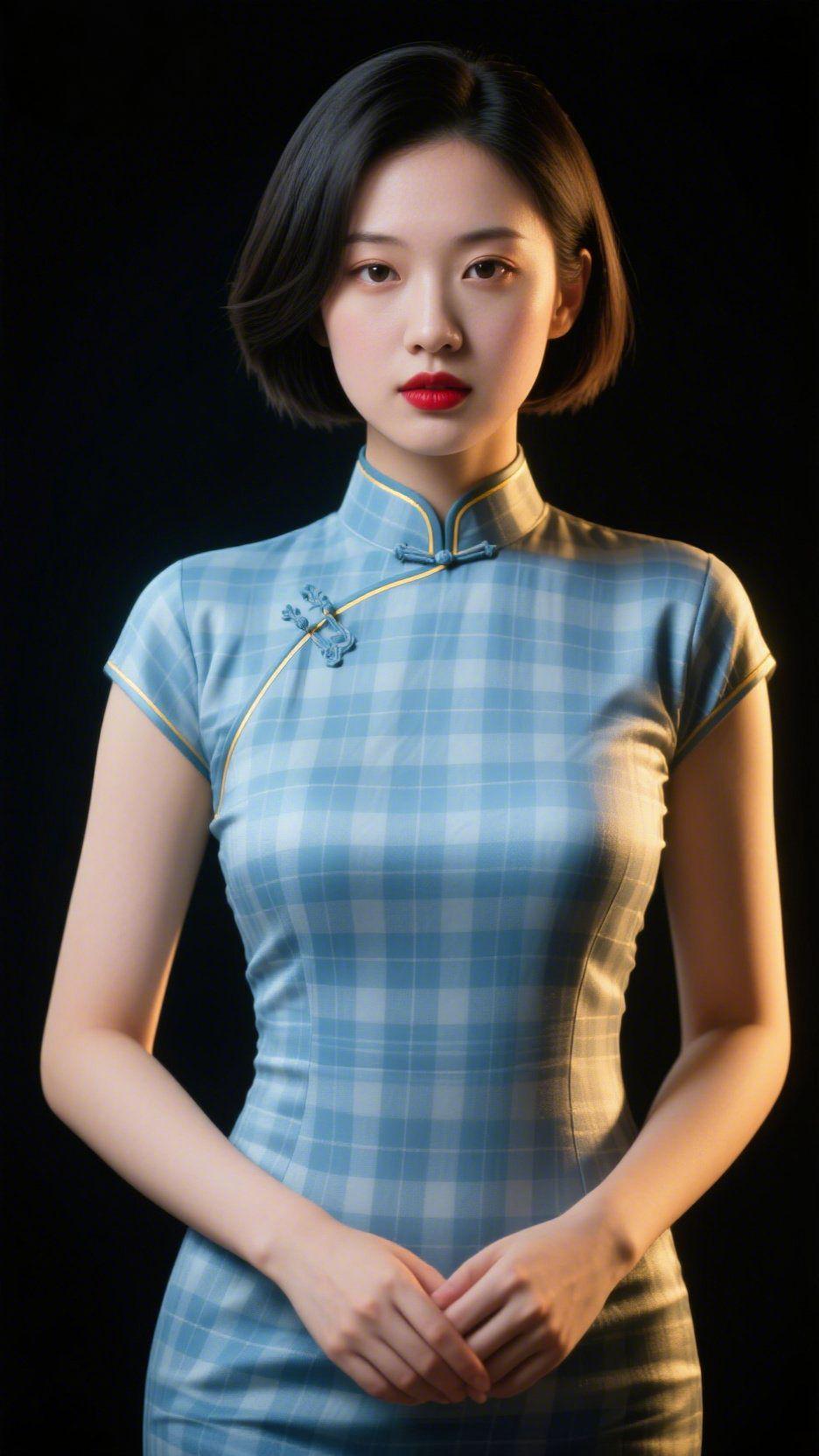 《青格旗袍裹清柔》 浅青瓷色的格纹旗袍覆着缎面柔光,斜襟盘扣似润玉般妥帖,领口金边衬得色调愈发明和。短发轻垂耳侧,唇色明润如红樱,将春日的柔意轻落在眉眼间。 她立在素净背景里,肩头落着细碎暖光,指尖交叠的弧度浸着温和的松弛。中式之美从不是张扬夺目,是这样的舒展——如窗棂漏下的软光,似雨后苔痕的淡韵,无浓烈起伏,却让岁月的雅致藏在每处温和细节里。 生活的韵致原是这般,无需刻意,便接住满季的温柔与清雅。 青格旗袍韵 中式温和美