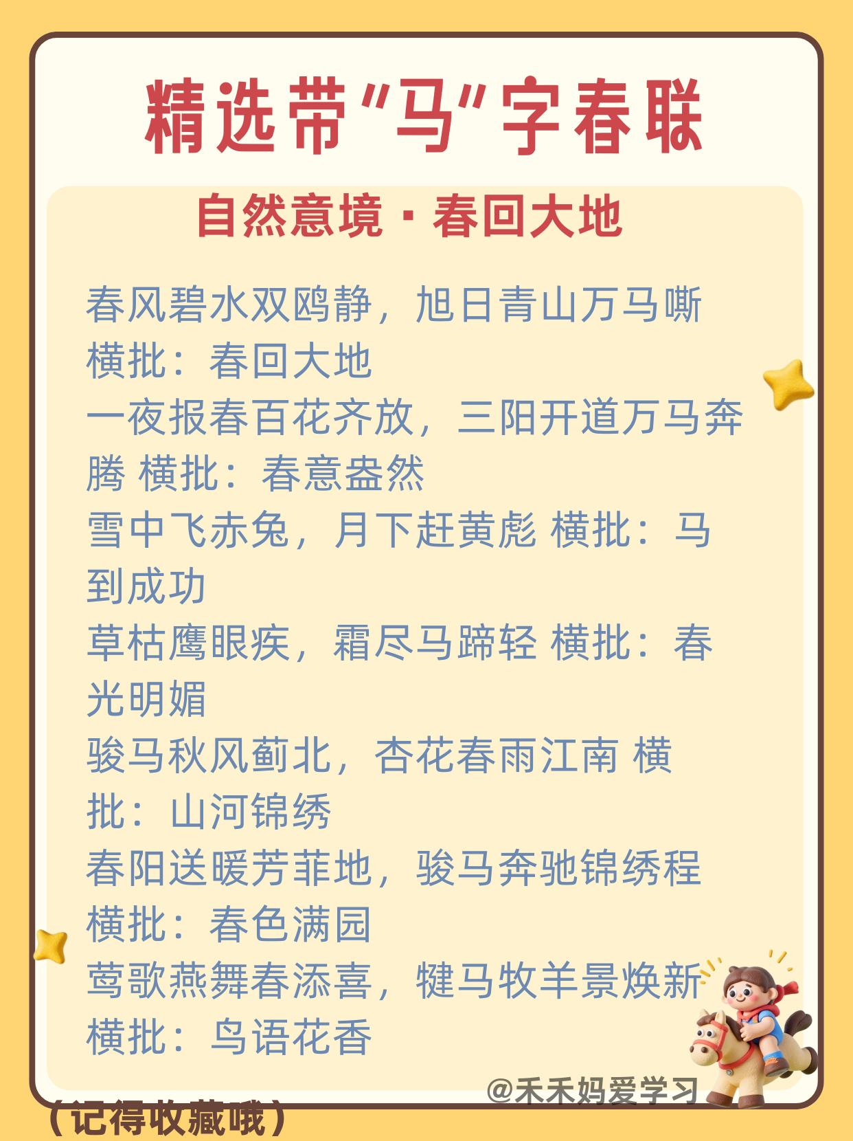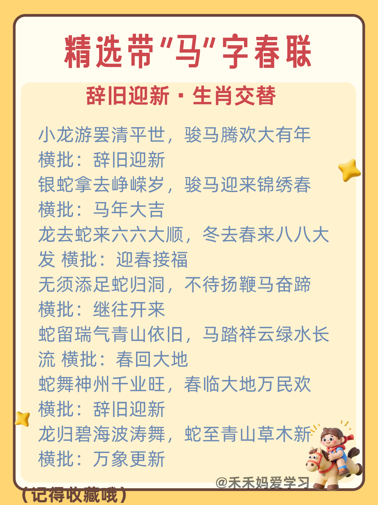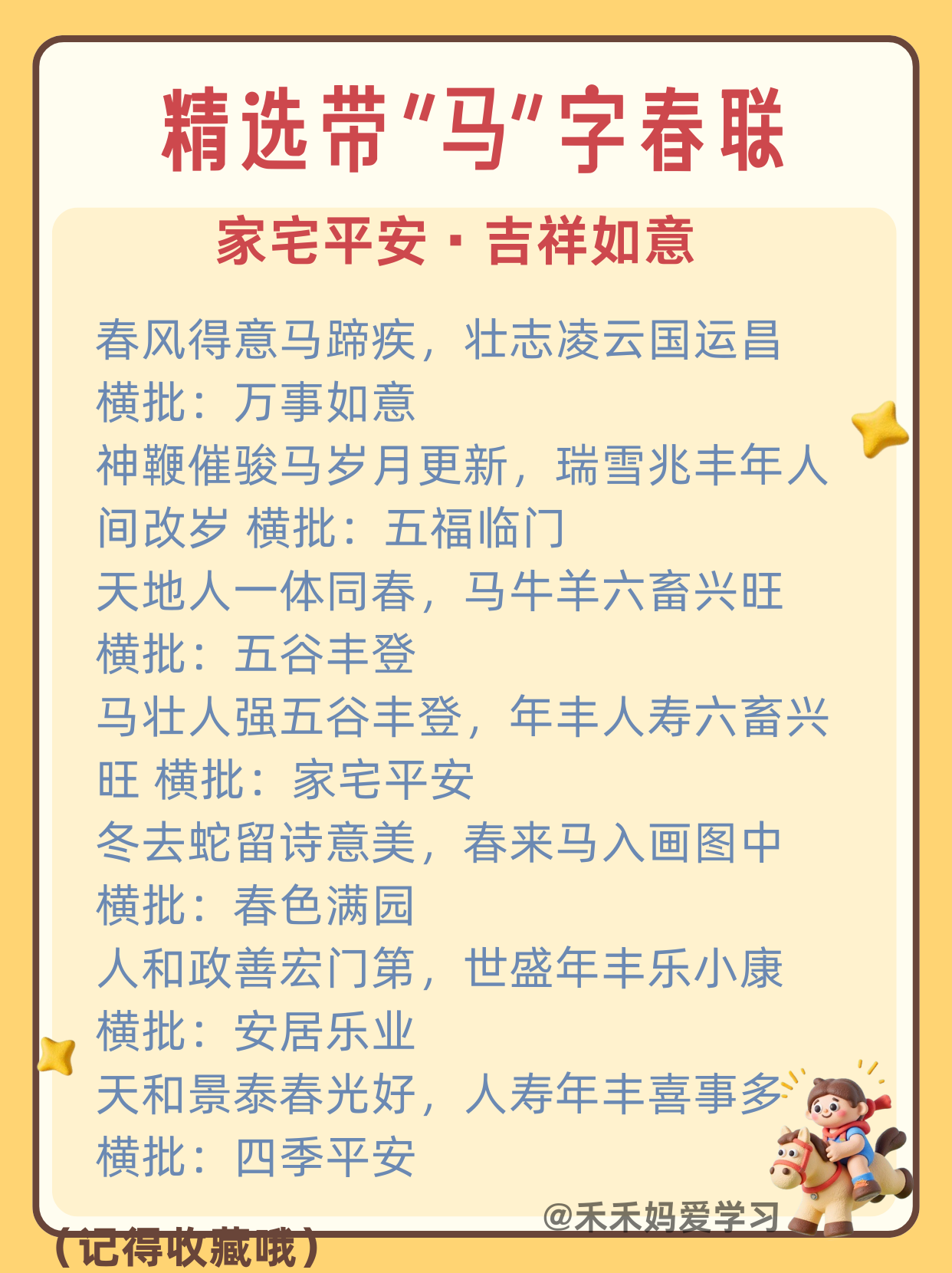 给大家分享一些含马字的好春联,涵盖事业腾飞、家宅平安、福寿安康、国泰民安等多重寓意,愿诸君按需择取,贴出新春气象。