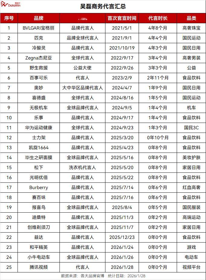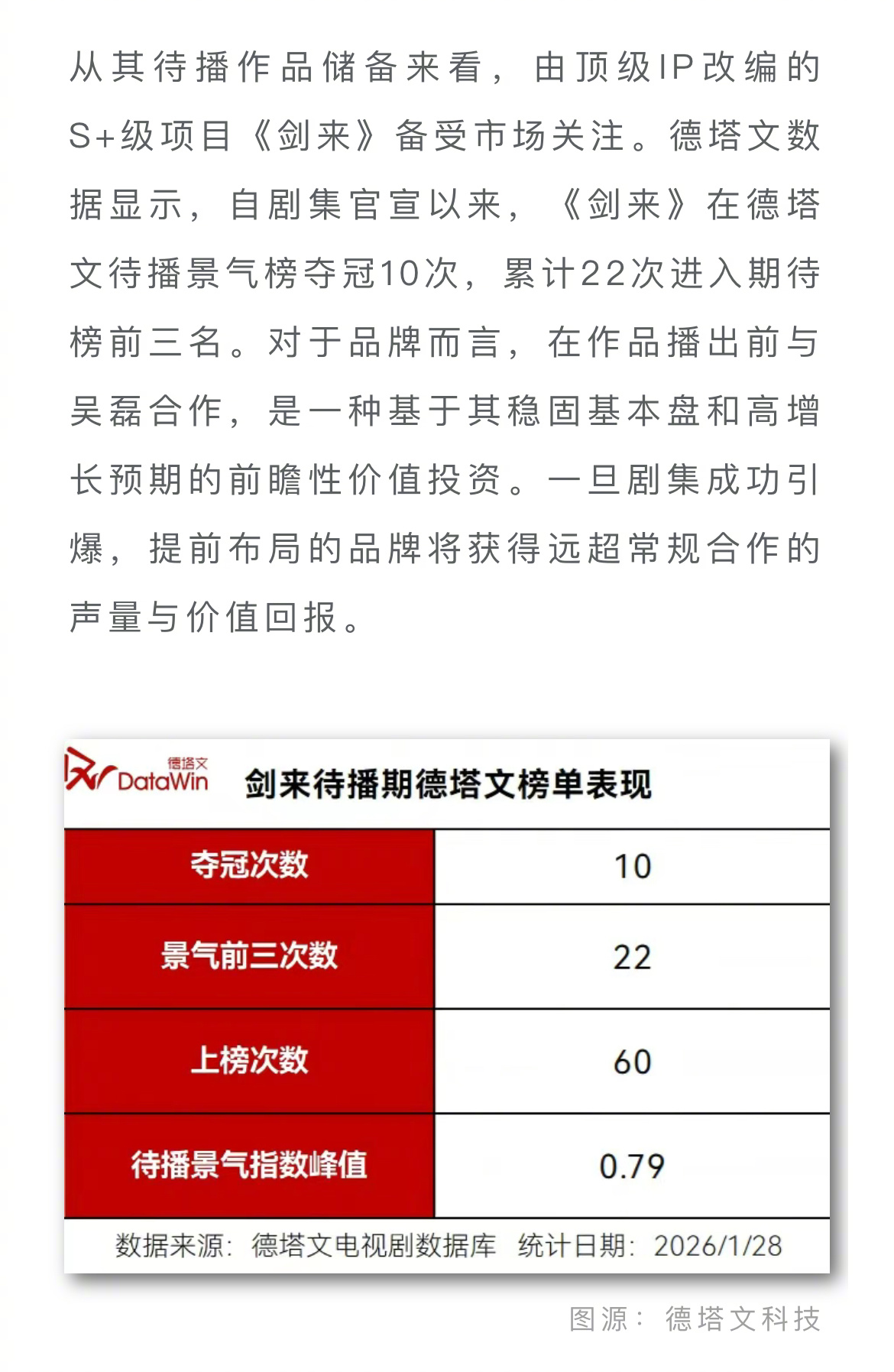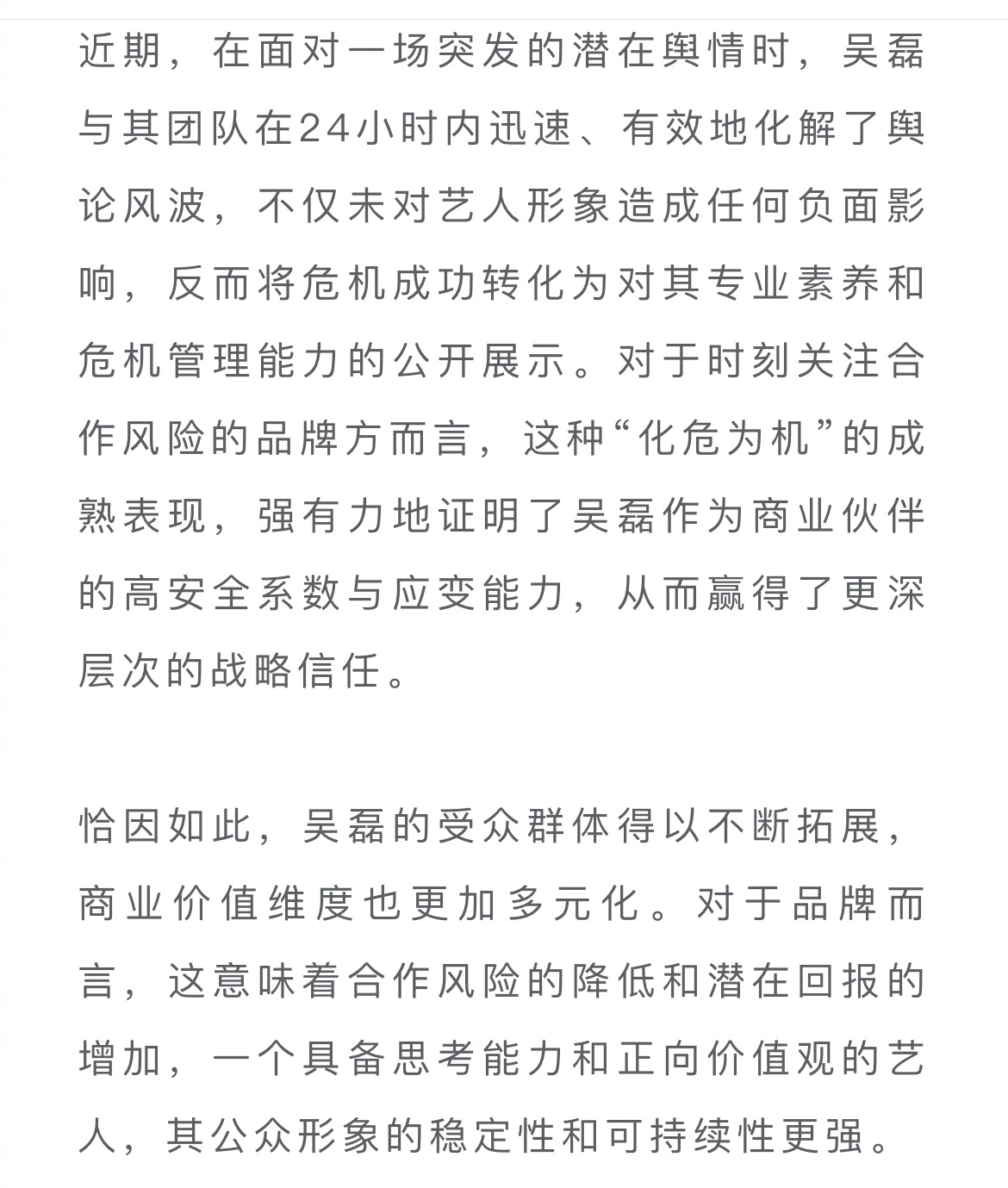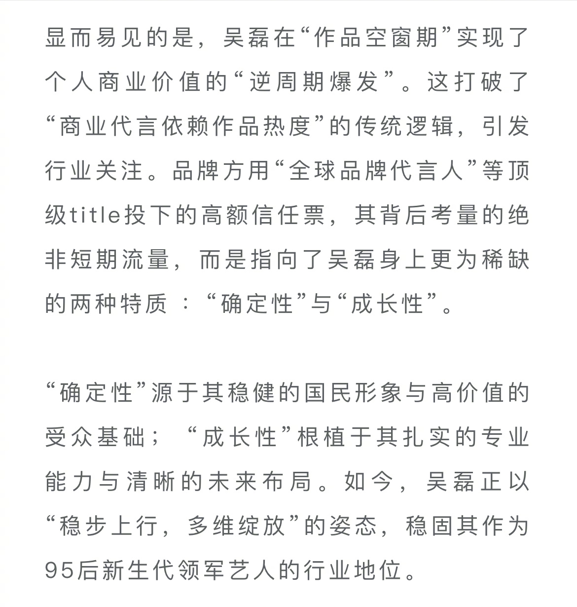 媒体评吴磊逆势爆发德塔文认证吴磊在“作品空窗期”实现了逆势爆发。2025年虽没有新的电视剧作品播出但却接连签下11个高质量商业合作。打破了“商业依赖作品热度”的传统逻辑。体现了吴磊身上更为稀缺的两种特质 :“确定性”与“成长性”。商业价值的进阶、形象与实力的积淀、格调与责任的并行……吴磊正在以“稳步上行,多维绽放”的姿态,稳固其作为95后新生代领军艺人的行业地位。如此积极正向的国民形象与高价值的受众基础,也让他成了内娱独一份的存在。低调逆袭的磊子好争气