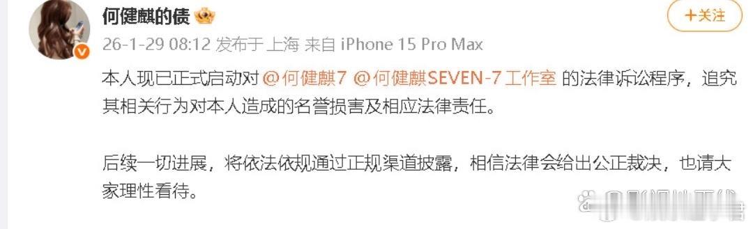 前女友起诉何健麒29日,何健麒前女友发文称已启动对何健麒及其工作室的法律诉讼程序,“将追究其相关行为对本人造成的名誉损害及相应法律责任。”