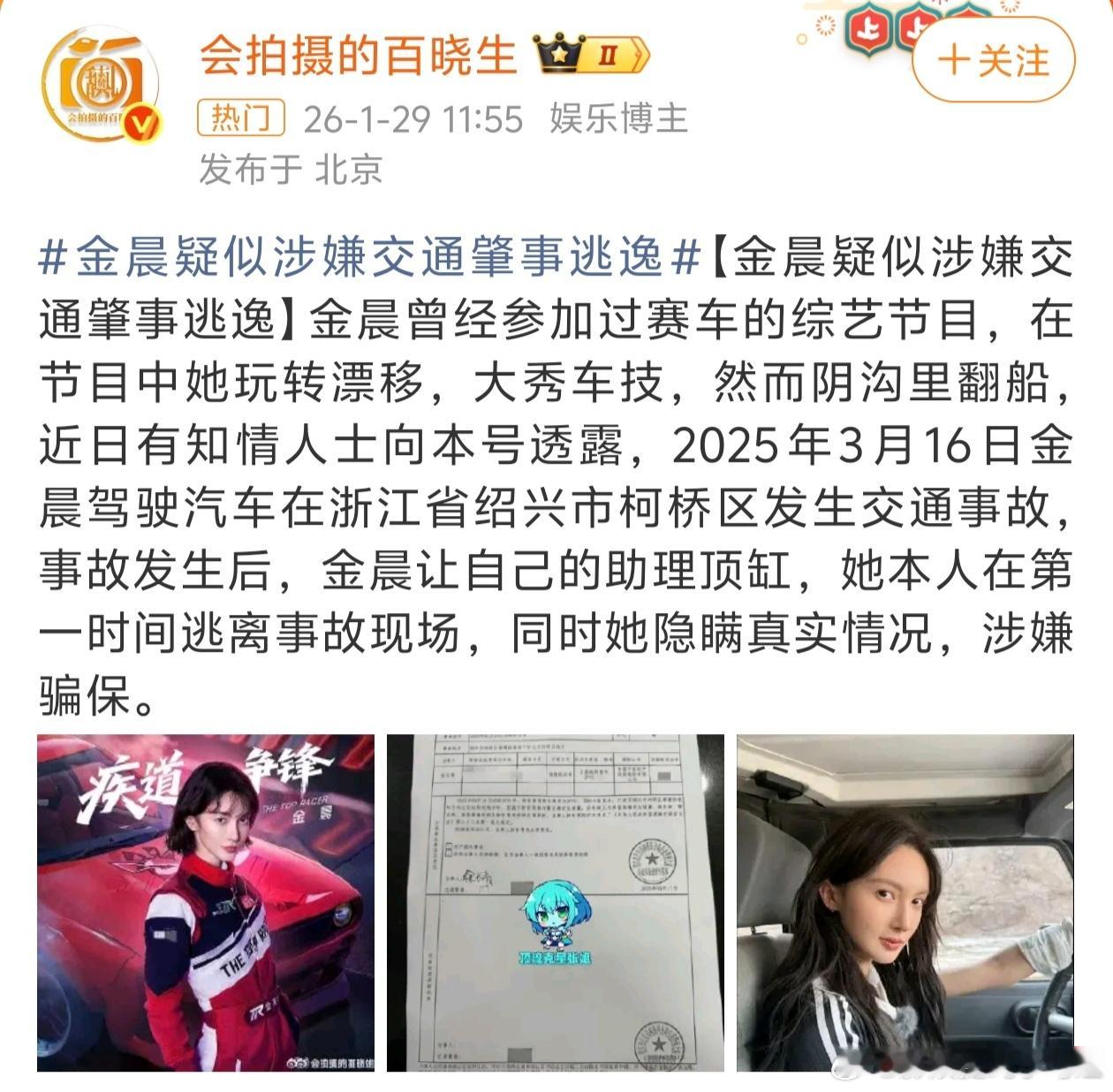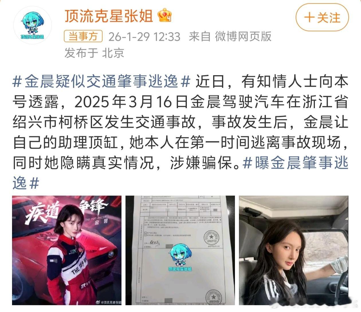 曝金晨肇事逃逸根据狗仔爆料,去年三月份金晨涉及到一起交通肇事逃逸事件,金晨遇事后让助理顶锅。而这件事具体情况如何,据说还在核实中,金晨也并未对此回应。从目前情况来看,这件事颇有疑点,狗仔是如何打听得知是助理顶锅?还是助理主动告知狗仔?无论真假,但去年三月的事既然能够被爆出来,说明一定有人从中在作梗。