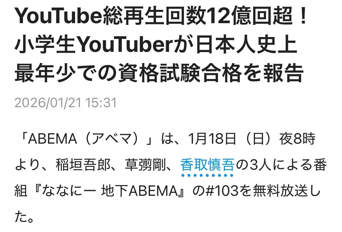 “AbemaTV”于1月18日(周日)晚8点,免费播出了由稻垣吾郎、草彅刚、香取慎吾三人主持的节目《Nanani - 地下ABEMA》第103期。 本期主题为“一看就停不下来!爆火萌娃大集合SP第五弹”。 节目云集了众多人气萌娃。其中包括了引起歌手CHANMINA在社交网络关注的“Tokiha情侣档”,来自“KOGYARU”的小学辣妹模特Imopi、Yunachi、Ruripi,以及来自“Natuul”的Nayu、Kanna、Rumina。演播室里,孩子们展开了激烈的才艺比拼。 其中,最受瞩目的当属YouTuber Riona酱。 她因先天性疾病导致身材矮小,却以元气满满的视频收获了大量人气。在她以居家生活为主的视频中,面对正在打扫卫生的父亲,她会说出“你以为打扫完就能去打麻将?大错特错!”这样犀利的吐槽,完全不像小学三年级的学生。其视频总播放量已达惊人的12亿次。 在演播室里,“Cya~n”组合的天野博之问道:“会被妈妈骂吗?”Riona酱回答:“最近被骂了。因为算术作业怎么也搞不懂,就去问了ChatGPT,结果被发现了。”这番关于最尖端“作弊方法”的坦白,引得全场爆笑。 而当稻垣吾郎问及“将来的梦想是什么?”时,Riona酱立刻回答:“成为叱咤风云的女社长。” 她充满力量地表示:“我想成为一家能帮助他人、给他人带来笑容的公司的社长。”香取慎吾则佩服地评论道:“已经有社长的风范了。” 接着,香取向一同在场的Riona妈妈提问:“为什么Riona酱会是这样的(性格/角色)呢?”妈妈回答:“我也不知道… 从她上幼儿园开始就已经是这样了…” 并解释了开始做YouTube的初衷:“女儿患有先天性疾病,起初是希望让更多人知道有这样的孩子存在。但在发布视频的过程中,大家开始觉得‘这孩子说话真有趣’,就这样引起了话题。” Riona酱非常喜欢韩国偶像和K-POP,并表示未来想掌握韩语。 她还透露,自己已经以日本史上最年轻的年龄通过了韩语能力考试(TOPIK)3级,演播室里顿时响起了“好厉害!”的赞叹和掌声。