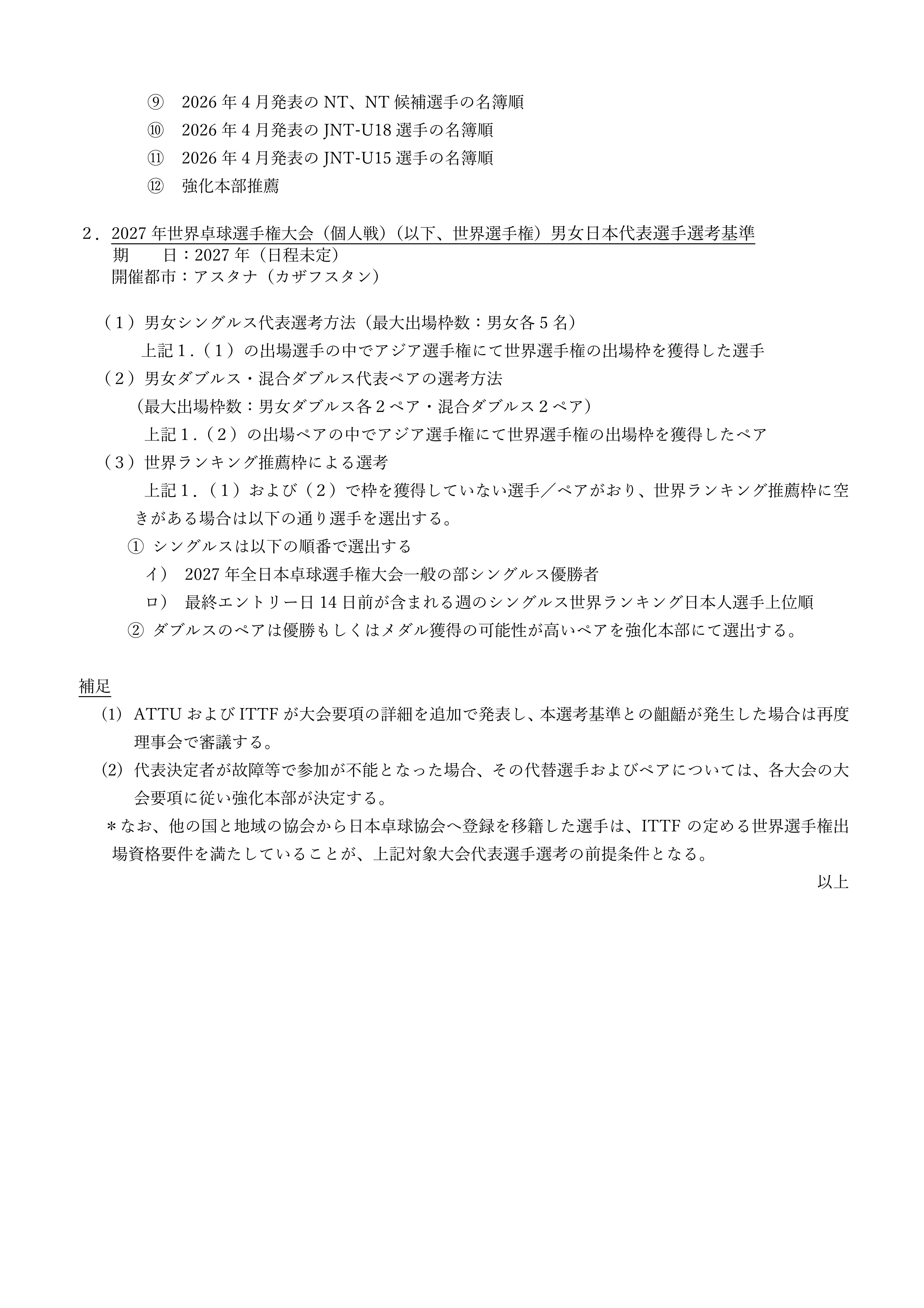 JTTA26亚锦选拔标准出台 26年日本亚锦男女团体、单打代表选拔(各5人)直接入选:亚洲锦标赛最终报名日14日前所在周的世界排名日本前3选手亚洲锦标赛日本代表选拔会冠军2026年全日本锦标赛成人组单打冠军补充选拔:若上述人选有重复导致未满5人,则按亚洲锦标赛最终报名日14日前所在周的世界排名(排除已入选者)由高到低补充双打、混双代表选拔(各2对)在单打选拔产生的选手基础上,由强化本部根据夺冠或 获得奖牌可能性决定组合可额外增补男女合计最多4名双打专用选手选拔会概要时间:2026年5月26 - 28日(预定)地点:所泽市民体育馆赛制:24人分8组进行循环赛,各组第1名共8人进入淘汰赛,全部比赛为BO5胜制参赛资格(按顺序选拔至24人):2026年全日本锦标赛一般组单打前8(除冠军外)选拔会举办30日前所在周世界排名前20(除上述选手及全日本锦标赛冠军)中前4名2025年全日本社会人锦标赛单打冠军、2025年全日本大学综合锦标赛单打冠军 2026年全日本锦标赛青少年组前4、2025年世界青年锦标赛U19/U15单打冠军等 2026年4月公布的NT、NT候补选手、JNT - U18/U15选手及强化本部推荐选手