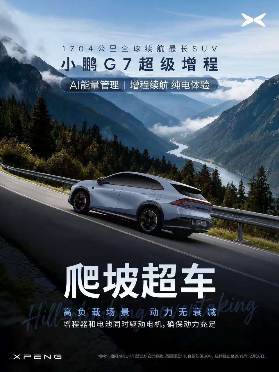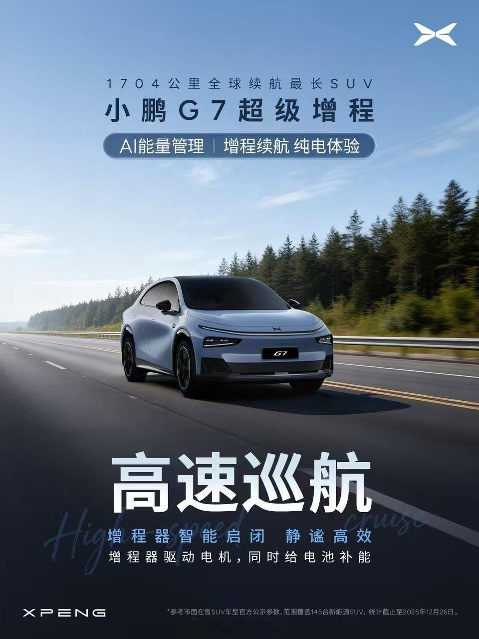 小鹏G7增程续航纯电体验开小鹏G7去撒欢玩雪小鹏G7超级增程,为你全程护航,让快乐出行无惧严寒!小鹏G7超级增程纯电续航达430km,综合续航更高达1704km,跨省自驾也安心无忧;搭载AI能量管理系统,智能预判路况与气候,冬季能耗更优化;配备800V高压平台 + 5C超充技术,仅需12分钟就可以补能314公里,一杯热咖啡的时间,续写千里雪途的精彩旅程!小鹏G7超级增程无论风雪多大,温暖与电量始终在线,用大空间装下雪板、行李与满车欢笑,来一场走就走的冬日之旅!