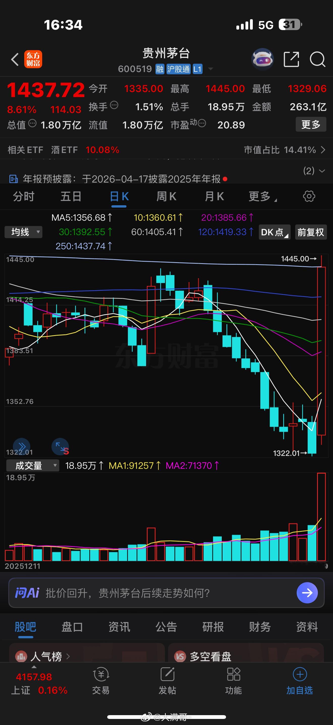 贵州茅台今天大涨原因找到了?!今日看盘