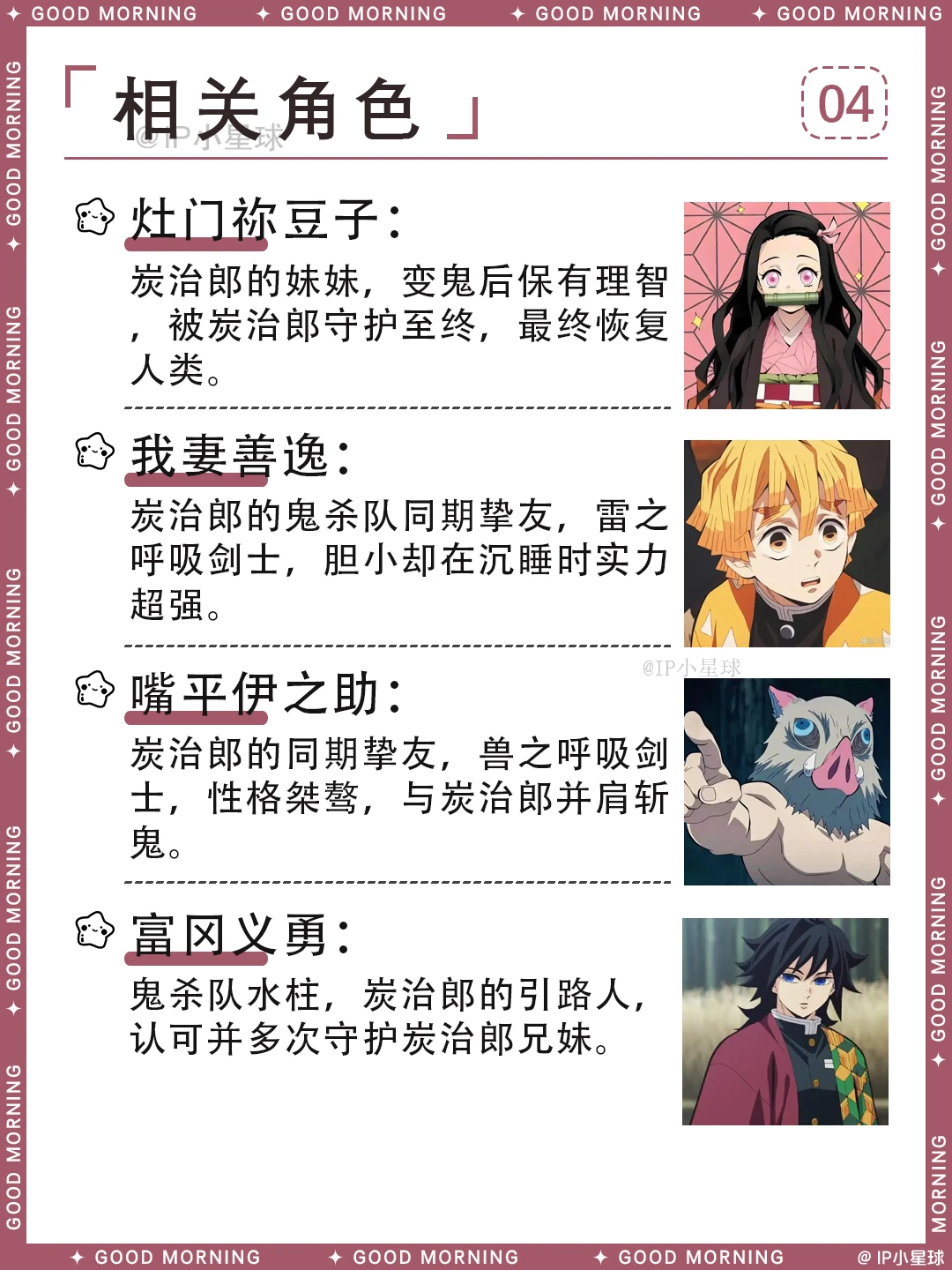 本是平凡卖炭少年,却因家人遭难,带着变鬼的妹妹祢豆子踏上斩鬼之路。眉眼温柔却有着极致的坚韧,哪怕对恶鬼也心怀共情,手握黑色日轮刀,解锁通透世界、赫刀一路成长。和善逸、伊之助并肩作战,用温柔守护想保护的人,用力量对抗世间黑暗,这样的炭治郎真的太戳心了!