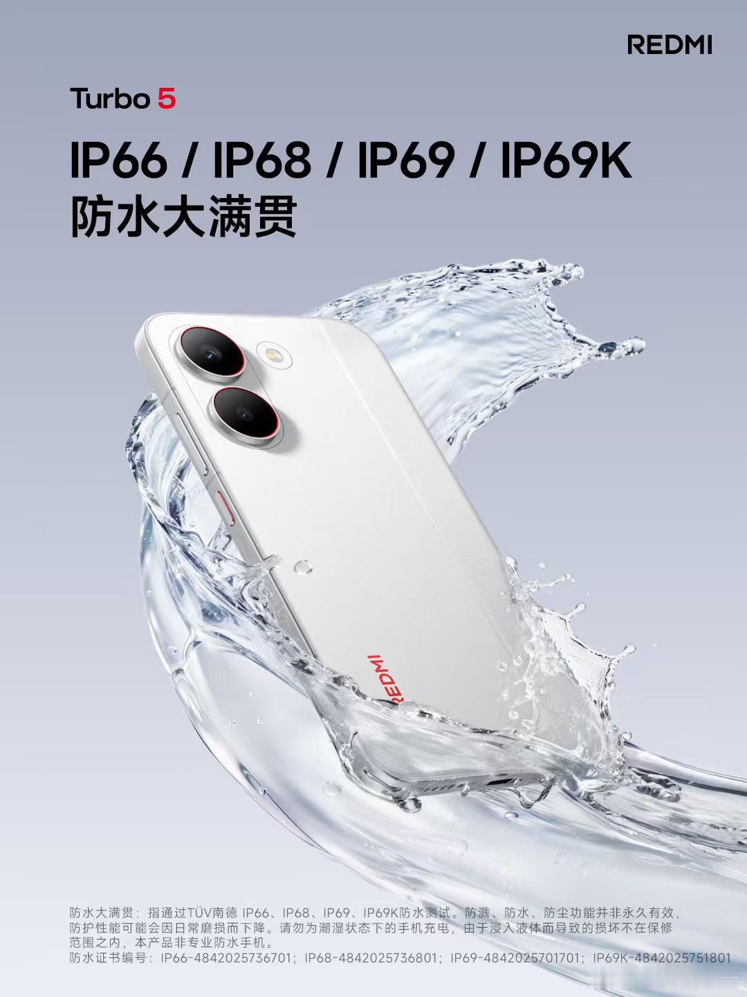 Turbo5 质感升级,体验更出众① 6.59 英寸黄金中尺寸,兼顾手感与视效② 2K 档罕见金属中框,质感出众,坚固耐用③ 7560mAh超大电量 + 100W有线秒充,电力持久④ 更有 IP66、IP68、IP69、IP69K 防水大满贯暗影黑、祥云白、浅海青,三色可选