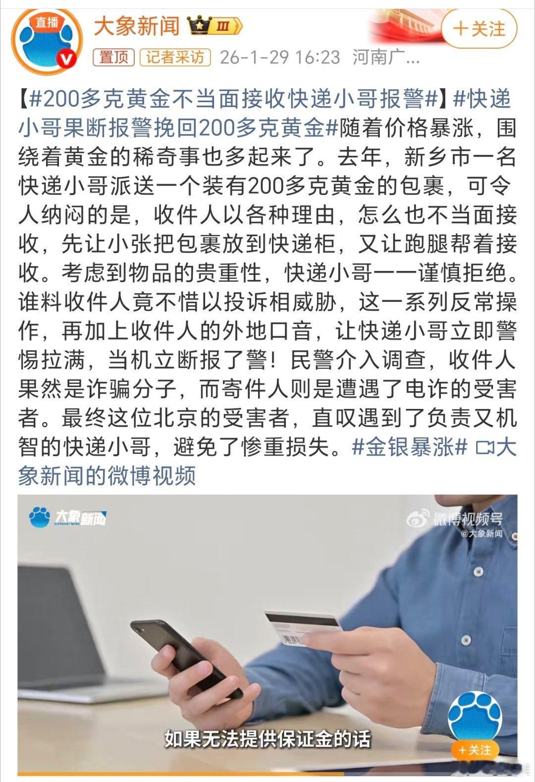 200多克黄金不当面接收快递小哥报警电诈手段层出不穷,马上过年了,大家一定要守护好自己的钱袋子,天上不会掉馅饼!