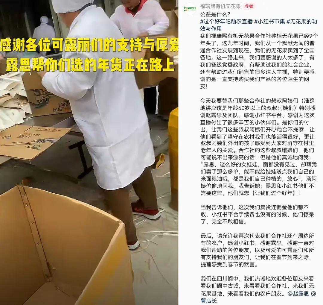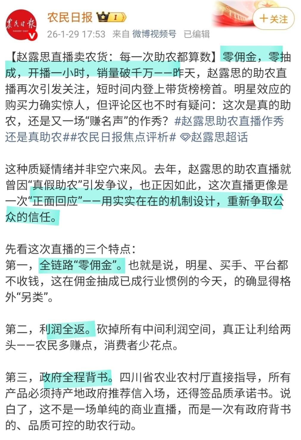 赵露思助农热评:每一次对农民的帮助,都算数! 这次赵露思助农直播,是由当地zf全程背书,而且零佣金,利润全返到农户手里! 从之前的风波来看,大家都觉得她估计不会再做吃力不讨好的事情,但赵露思坚持做对的事,依旧在以自己明星的流量,给更多的农户,甚至留守儿童提供自己的帮助。 农民日报也发布相关视频和社评:每一次对农民的帮助,都算数! 赵露思