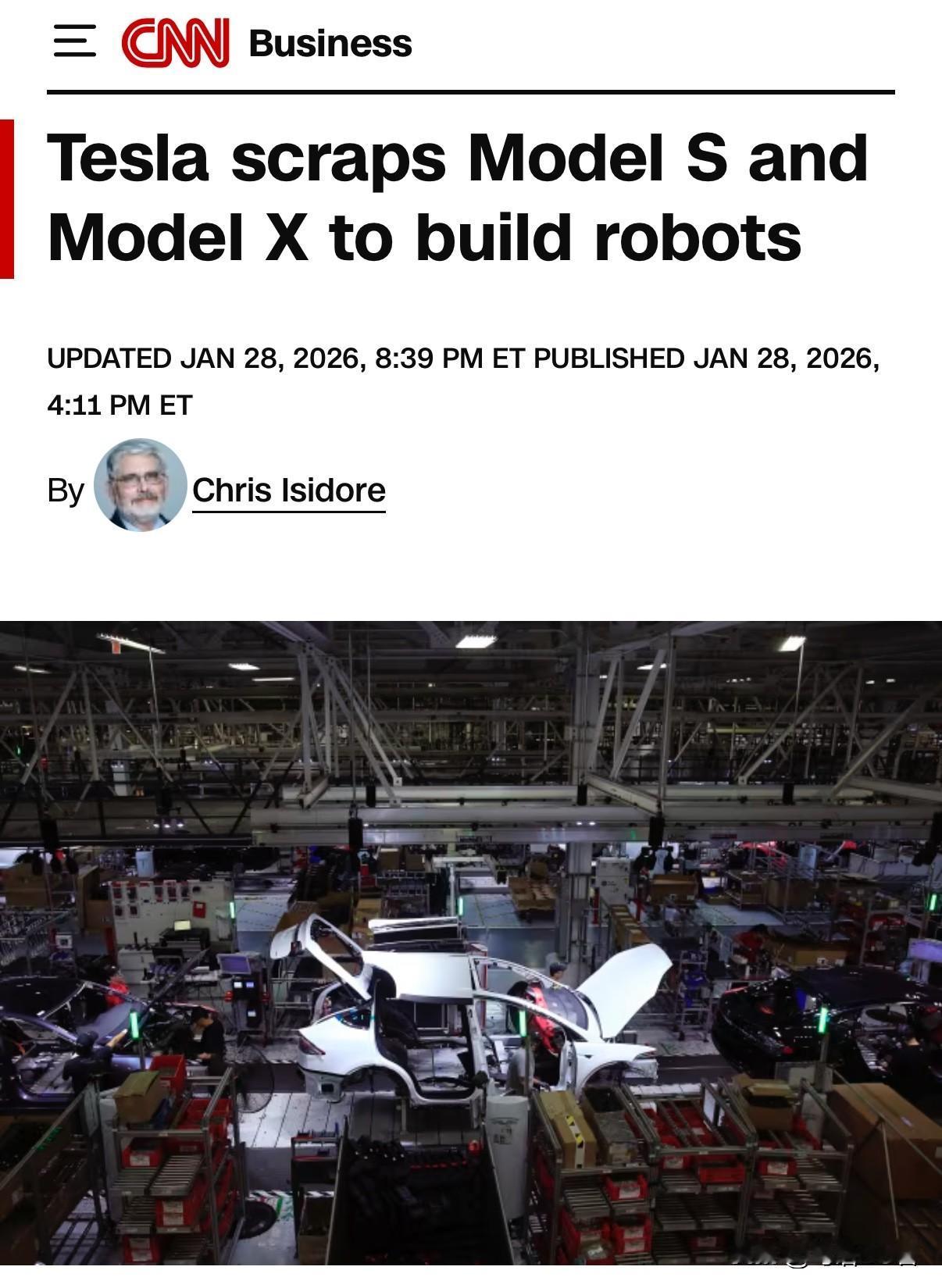 机器人,或者说人形机器人,真的很快就要进入我们的生活了。 在周三的财报电话会议上,马斯克宣布停止生产两款车型——Model S和Model X,这是该公司最昂贵的车型之一。该公司将利用该工厂空间制造人形机器人。 周三,特斯拉表示,其调整后收入在2025年的最后三个月下降了16%。其净收入进一步暴跌,本季度暴跌61%,全年暴跌46%,下降33亿美元。该公司在第四季度公布了有史以来最大的同比销售额下降,也是迄今为止这家同时以近50%的速度增长的公司年销售额的最大下降。 报道称,去年,该品牌的声誉在美国和欧洲买家中受到打击。马斯克参加各种政治活动以及他与川普的密切关系遭到了强烈反对。在取消对电动汽车买家的7500美元税收抵免后,所有美国电动汽车的销量在今年晚些时候下降。 马斯克的人形机器人,或是他下一个爆发点吧。 图 自CNN
