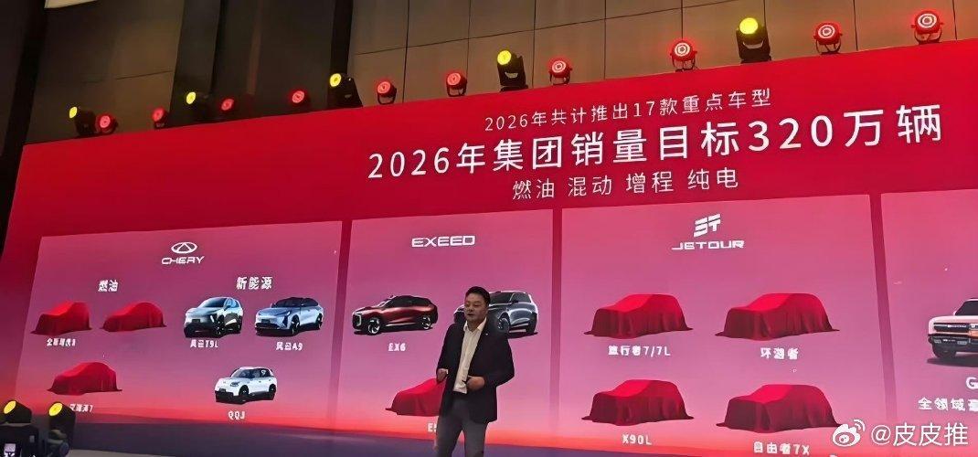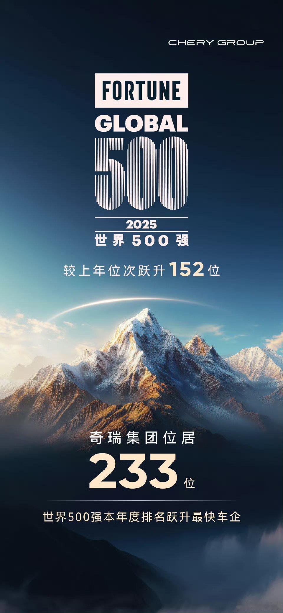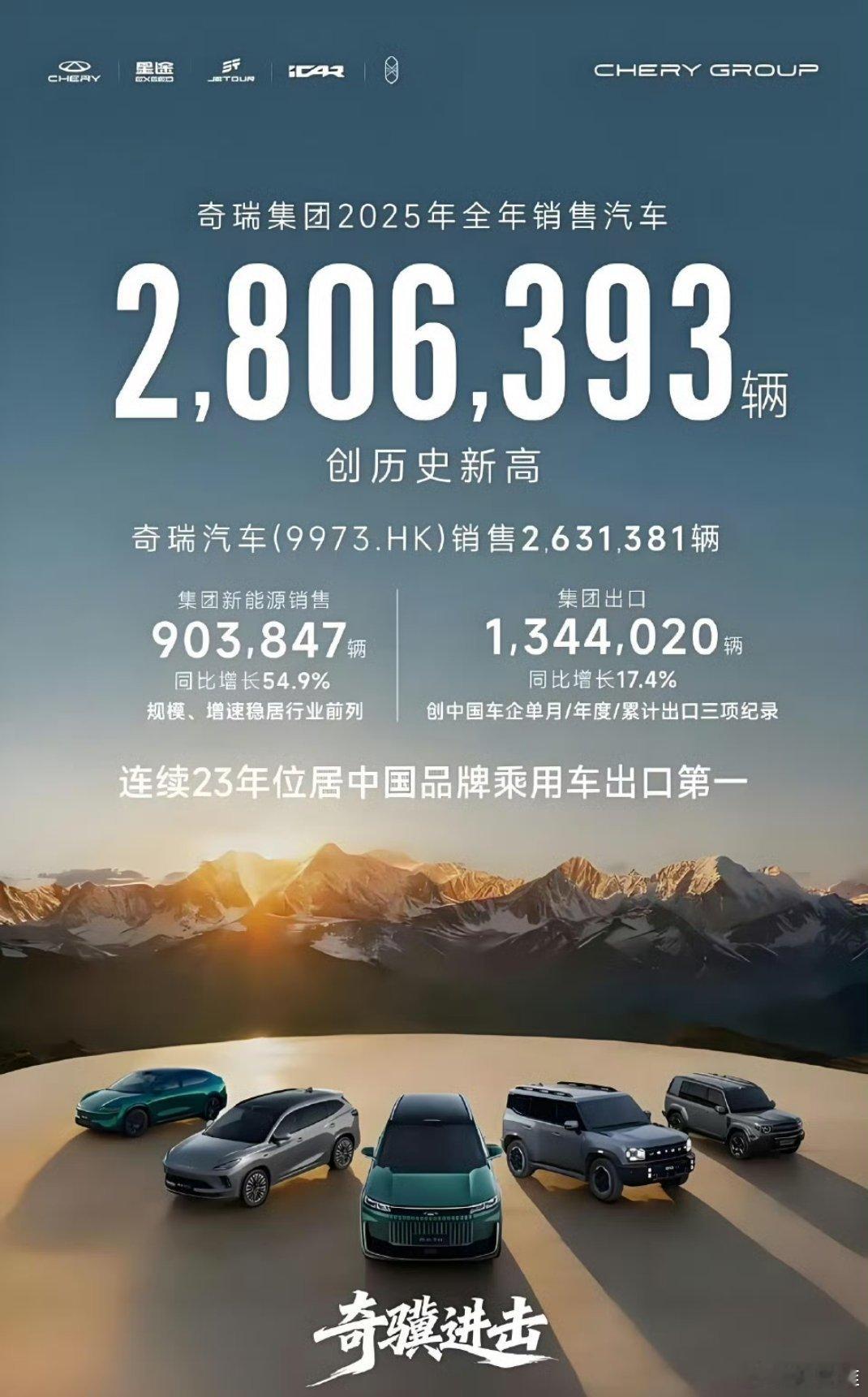 中国新能源汽车持续领跑全球新能源汽车还得看中国!过去一年,以奇瑞为代表的国产新能源汽车,在国内和海外都交出了令人满意的成绩。近日,奇瑞集团公布了2025年全年累计销量280.63万辆,同比增长7.8%,全球累计用户突破280.63万辆。2025全年出口134.40万辆,同比增长17.4%,累计出口汽车585万辆。值得一提的是,奇瑞已经连续23年蝉联中国品牌乘用车出口第一的好成绩。此外,奇瑞集团发布了2026年全年的战略目标:320万辆销量,奇瑞正在往电动化、智能化加速推进。目前奇瑞旗下有奇瑞、星途、捷途、纵横、iCAR五大品牌,品牌梯队清晰。在销量稳步增长和新能源汽车快速发展的同时,2025年奇瑞汽车完成了港股上市,这标志着奇瑞开启资本全球化阶段。奇瑞集团在2025《财富》世界500强排名中跃升至第233位,排名较上年大幅跃升152位。以奇瑞为代表的中国新能源汽车,正在引领产业深耕新赛道、站上新高度!科技先锋官