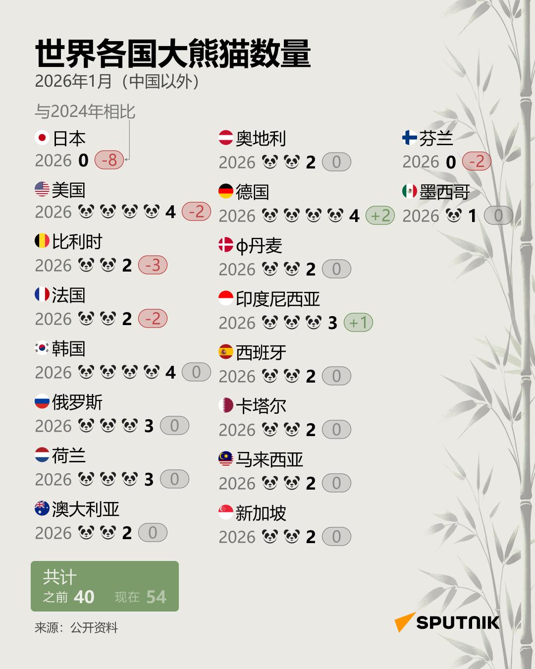 2024-2026年中国熊猫外交的全球分布 俄罗斯卫星通讯社 2026年1月29日, 19:33 (更新: 2026年1月29日, 22:44) 据共同社报道,大熊猫双胞胎“晓晓”和“蕾蕾”已离开它们出生的东京上野动物园。这是自1972年以来,日本首次没有大熊猫。关于中国大熊猫在全球各国数量变化的详细信息,请参阅俄罗斯卫星通讯社的信息图表。