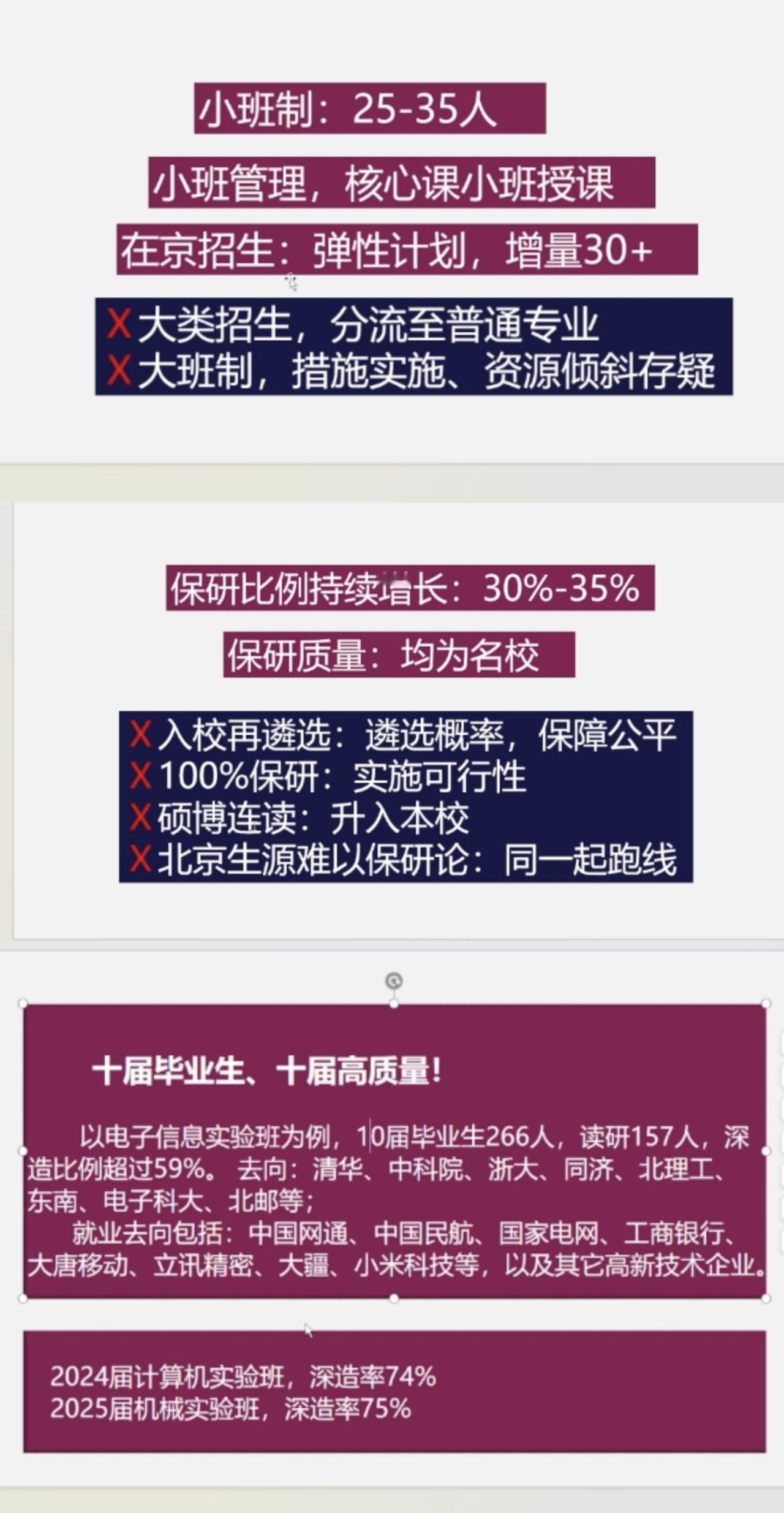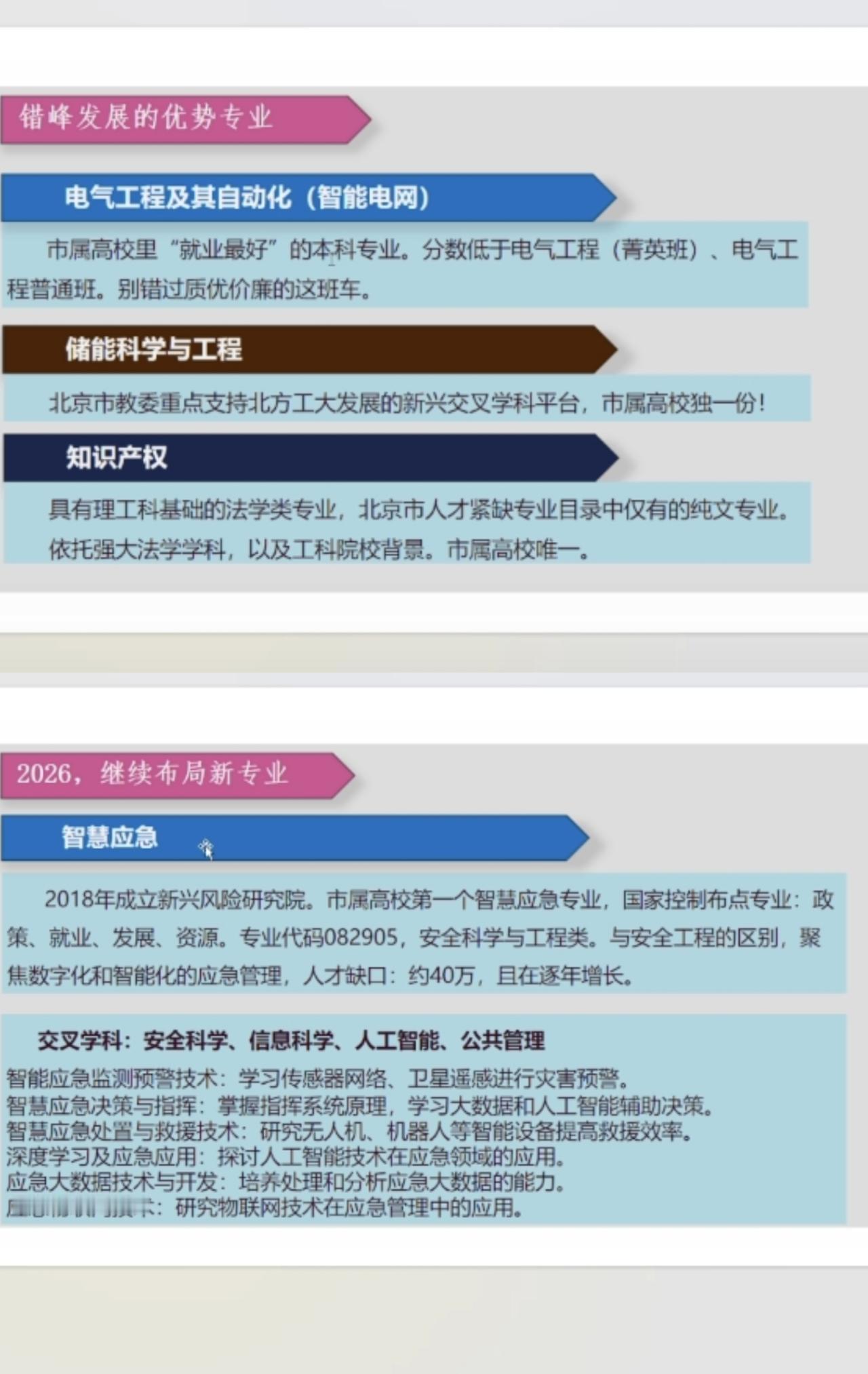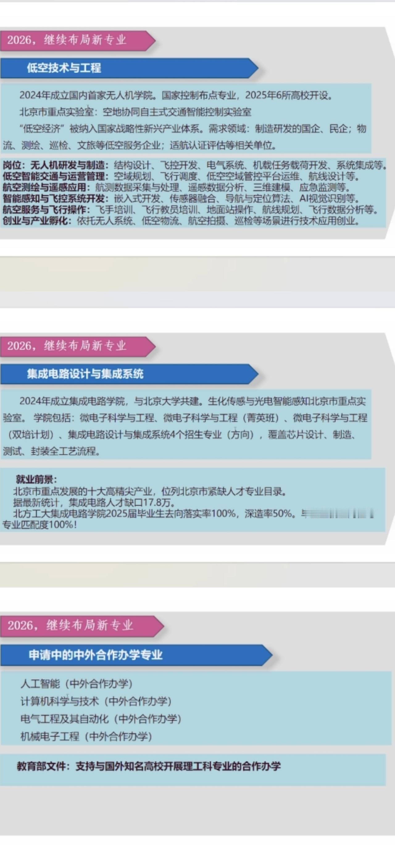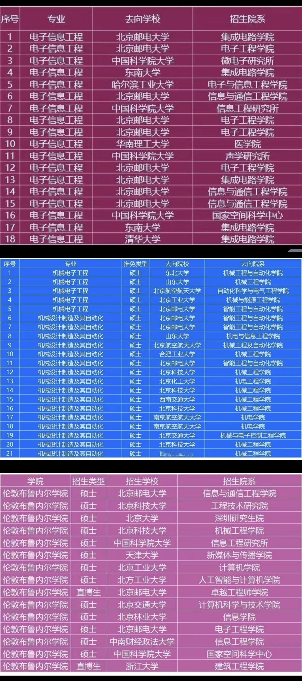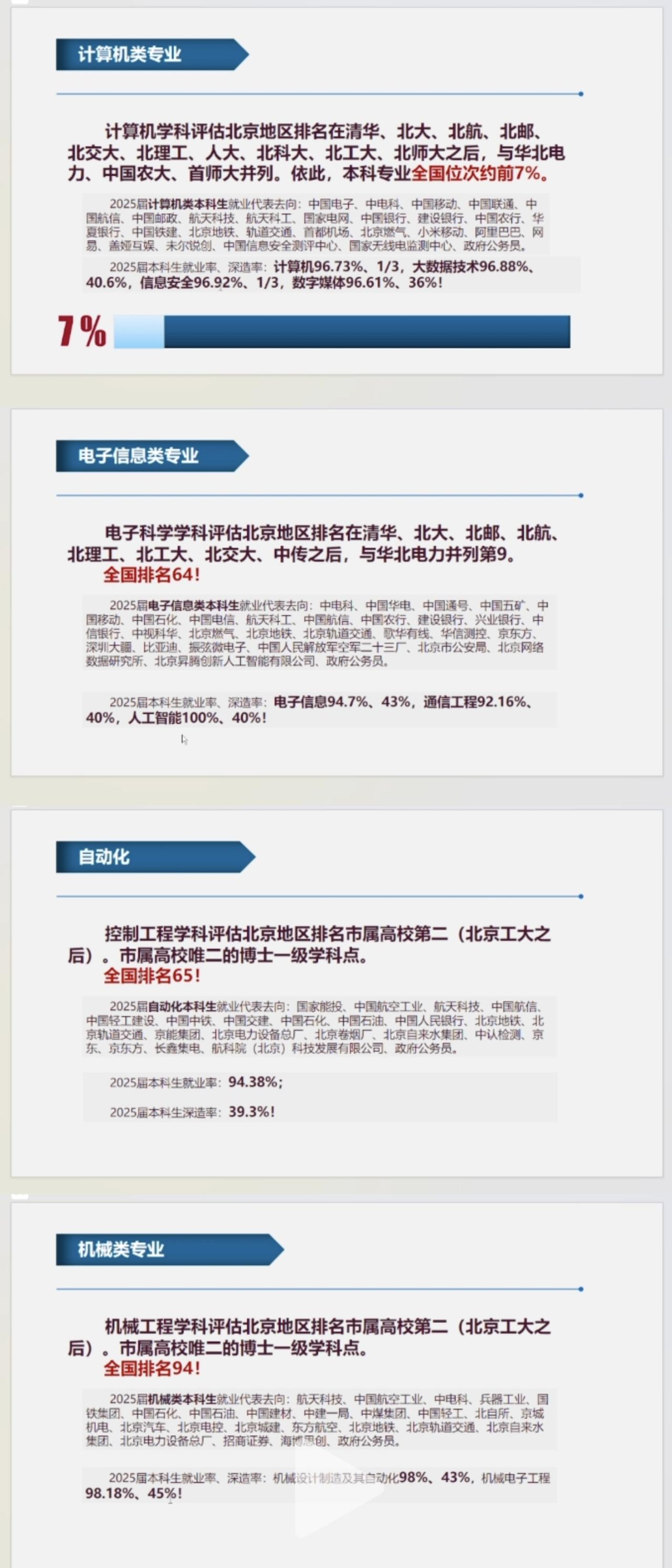 北方工大是越来越牛了,你看看其2025届本科毕业生的保研去向就知道了,也难怪家长对它的关注度越来越高。 保研的学生有去清华的北航的,也有中科院国科大的哈工大的,还有北邮的北交的中财的,就连中外合作办学都有保研去北大的浙大的天大的,是不是很可以的了。我敢说,这是外地很多双非高校根本不能比的。 北方工大有好几个实验班,录取分数线会高一点,整体保研比例能到35%左右了,有些实验班深造率甚至能达到75%,比如25届机械实验班。长期来看,根据老师提供的数据,电子信息工程实验班十年来毕业266人,读研157人,深造率接近60%,这还是前几年深造比例还没起来的情况下取得的。 北方工大的电气自动化一直非常热门,按招生处老师的话来说,是市属高校里最好就业的本科专业,学生去往国家电网、华电华能的很多,尤其是电网,录取人数仅次于一哥华北电力大学。后期,还可能有电气工程及其自动化的中外合作办学,从菁英班到普通班到中外合作,分数覆盖高中低段,不同分数的学生都有合适的选择。中外合作不知道2026年能不能招生,还在审批中,2027估计希望很大。 当然了,北方工大的计算机、自动化、电子信息工程和机械工程也都很有实力,都在全国前100强,有些接近前50名,毕竟是老牌工科院校。 今年,北方工大还会新增几个专业,比如智慧应急、低空技术与工程和集成电路设计与集成系统等,都是非常紧跟时代发展和结合北京地区实际的专业,毕竟大部分毕业生都在北京就业。 与布鲁内尔的中外合作办学也开展好些年了,成果丰硕。后期,还会增加几个热门的专业,比如计算机科学与技术、人工智能、电气工程及其自动化和机械电子工程等,很大概率2027年开始招生。 北方工大目前在在石景山办学,后期会有延庆校区,不算远,高铁直达,尤其适合昌平延庆海淀等西部北部的孩子。分数在520-610分的孩子都能在这找到合适的专业,选择范围还是比较大的。 北方工大也不是高枕无忧,也有竞争对手,那就是北京信息科技大学。相比北大清华北航北理中财外经贸,这对市属同城双子星高校从来不缺话题,竞争火力丝毫不低。从专业设置到高考录取分数,再到深造保研和就业数据,都是如此,家长群里讨论也都是热气腾腾。 最后看一下2025年本科招生生源较多的高中都有哪些?排在前几位的郊区名校居多,像大兴一中,潞河中学,密云二中,牛栏山一中和延庆一中都是此类,以前这些学校可都是在211高校北工大的榜单上的。 如果你也对孩子教育和就业感兴趣,可以私我入群,一群志同道合的朋友一起在这等你。