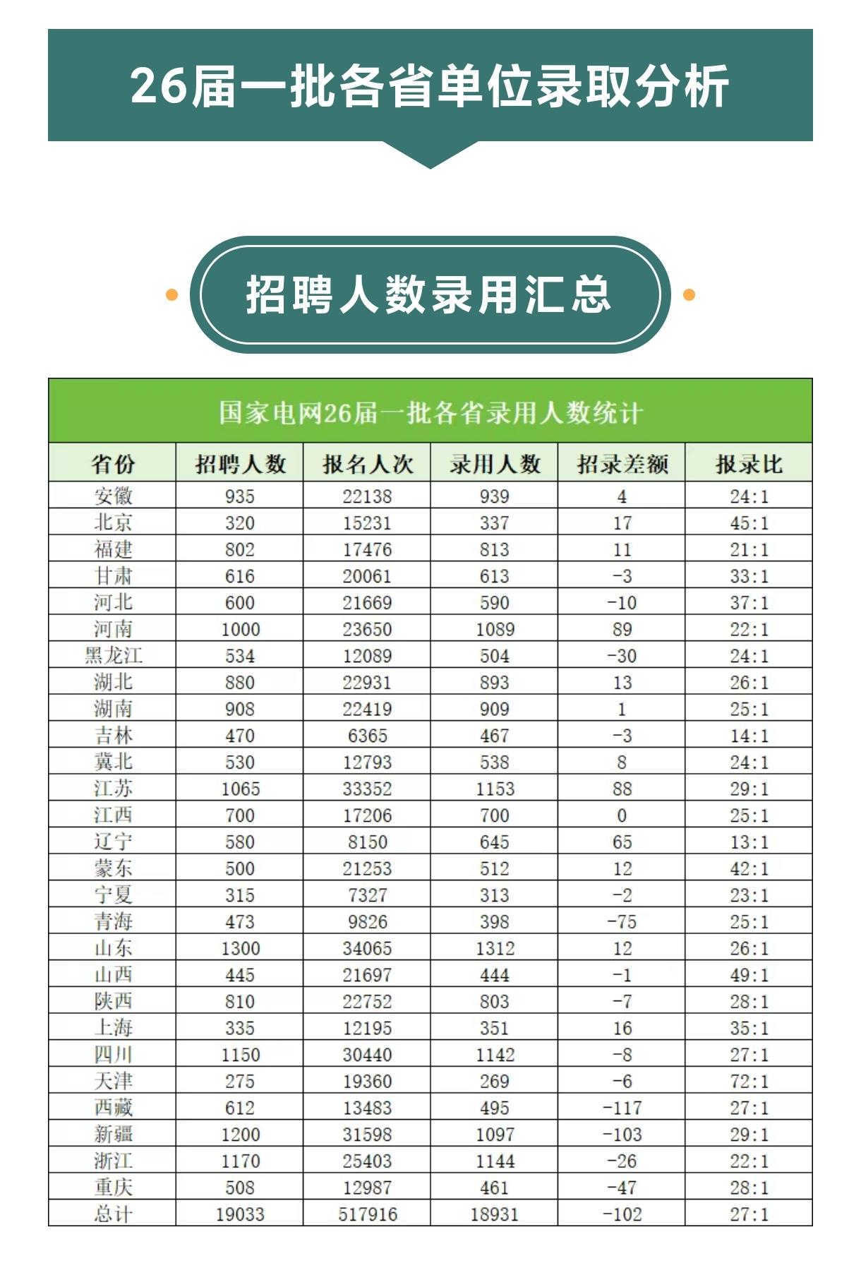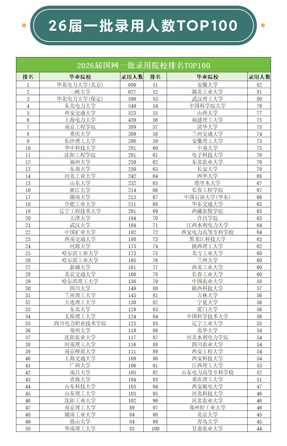 电气工程实力最牛的还是清华、西交和华北电力,别跟我扯别的。这从国家电网总部的录取名单就能看出来。清华不用说,西交号称国内第一,华北电力是行业内大哥,地位也在。 国家电网2026年第一批招聘录取结果已出来了,华北电力录取人数最多,两个校区分别排在第一第三,第二多的居然是三峡大学,这个我没想到,超过了东北电力大学,上海电力大学和西安交大等高校。 有14家省公司录取人数少于招聘人数,12家省公司录取人数多于招聘人数,27家省公司整体报录比为27:1。其中北京、甘肃、河北、蒙东、山西、上海、天津报录比超30:1。尤其是天津,报录比最高,72人报考,只录取1人,就算是天大电气毕业的,也是压力大啊。北京也不低,报录比45,竞争压力很大。 别看进电网的人多,但电气专业的毕业生更多,进电网的还是少数,大部分人还是去了企业。可千万别以为进了电气专业,就等于差不多进了电网,那是美梦。