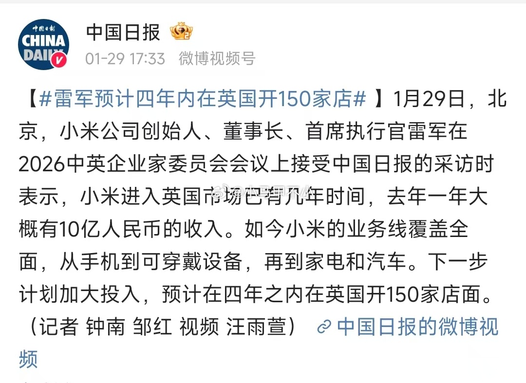 雷军参加2026中英企业家委员会会议这个活动规格很高,英国首相带了很多英国企业家过来。雷军预计四年内在英国开150家店