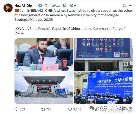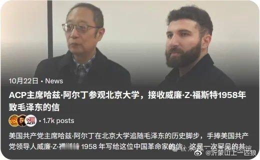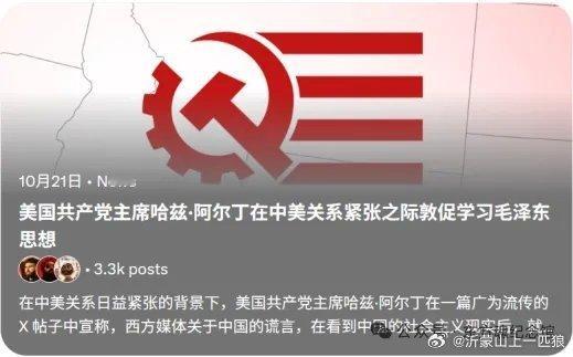 【四次引爆外网!美共主席访华高呼:学习毛泽东思想!中国共产党万岁!】近日,美国美利坚共产党执行主席哈兹·阿尔丁首次来华期间,在美国社交媒体连发多条信息,盛赞中国社会、共产主义与毛泽东思想,数次登上国际热搜,再次掀起红色浪潮,引起世界关注。阿尔丁是美国美利坚共产党执行主席,被视为美国新一代政治评论人与社会运动者的代表人物,在美国青年群体与新媒体舆论场中影响广泛。2025年10月17日至21日,受中国人民大学邀请,他第一次踏上中国的土地,与来自中、俄及欧洲多国的学者与前政要围绕主题进行深入探讨。阿尔丁多次表示,此行令他深刻体会到中国的社会活力与文化自信。他说:“中国的现代化不是照搬西方模式,而是为世界提供了新的可能。这里的社会秩序、创新精神与人民信念令人印象深刻。”当然,这些老生常谈的话题,都是我们心知肚明的,如果只是单单说这些,也不会引起这么大的关注。我们现在梳理下阿尔丁此次来华,引爆外国媒体的四次震撼发声:一、事情起源于10月19日,他发布首条推文,瞬间便引起轰动,浏览量超80万次,世界各国网友纷纷转发!原文如下:“我正在北京,受邀在中国人民大学的明德战略对话上发表演讲,代表美国新一代发声。中华人民共和国万岁!中国共产党万岁!”这句我们国人时常听到的口号,从一个美国人口中,尤其是美共执行主席口中说出就不一样了。配图中,他身着正装,在会议桌前认真发言。信息一经发出便引起激烈讨论。“中国人和美国人不是敌人,我们面对的是同一个敌人,美国统治阶级主导着世界。这是一场阶级战争。中国和美国都从贸易中受益,但只有一小部分利益流向了美国人民,而中国则将其重新投资于人民。”“我们正在落后。美国需要向中国学习。”群众的眼睛是雪亮的!这是一场阶级战争!二、次日,阿尔丁再度发出简短却掷地有声的一句——“共产主义是好的!”这次帖子发出后,再次引起网友的热论。各国网友纷纷表示支持称“中国特色社会主义已证明是成功的。”“共产主义是我们的解药”“美国需要共产主义”“共产主义正在蓬勃发展”。一位在中国生活了25年的底特律人也紧跟着发文:“良好的治理,欢迎入党”三、紧接着,阿尔丁站在天安门前,站在毛主席的画像前,再次抛出重磅言论!“学习毛泽东思想,西方媒体长期误导世界关于中国的叙事,但当你亲眼来到这里,一切偏见都会像纸老虎一样被风吹散。生活在社会主义中国,毛主席的精神依然延续。”这条鲜明带有政治立场的信息,涵盖甚广!“纸老虎”一词更证明他是毛泽东思想的忠实拥趸者!果不其然,这条号召学习毛泽东思想的信息再次引爆国外媒体,被多家海外媒体和社群转发,成为当日政治话题热贴!国外网友更是在评论区贴出小诗:“山峰直刺青天,锋芒未钝;若无山岳擎天,苍穹早已坠落。我们要学习毛泽东思想。”(应该是想表达毛主席的十六字令:山,刺破青天锷未残。天欲堕,赖以拄其间。)不少网友发出感慨:“中国的历史和文化因共产主义而得到提升,我们将在这里实现这一目标。”“有时候我在想:中国怎么一夜之间成了世界无可争议的头号超级大国?但随后我就想起:共产主义。”四、美利坚共产党官方账号发布毛主席相关信息!原来美国共产党前主席威廉·福斯特曾是毛主席的忠实追随者,他曾在1958年专程致信毛主席。今天,阿尔丁作为美共的新任主席,在北大参观之际,再次接受到了1958年美共主席写给毛主席的这封信。作为共产主义的学生,红色思想薪火相传在今天有了新的体现。这一刻我们更加深刻的意识到,毛主席作为伟大的无产阶级革命家,不仅指导着中国的革命进程,也曾如此深切的影响过美国共产党!毫不夸张地说毛主席指引着美国乃至世界的无产阶级革命者们!在国际共产主义运动中,毛主席有着显赫的成绩!毛泽东思想对世界的影响力,更是令国人自豪不已!瞧,这就是中国人民心目中最伟大的领袖,这是世界级的领袖人物!美共官媒的这则消息一经发出,阿尔丁此次探访上升了新的高度。我们能看到评论区中有人写道:“这场中国行让西方青年看到了中国的真实面貌”、“这是真正的思想交流”、“这是美利坚共产党莫大的荣幸”。还有人戏称他的行程为“《东天取经》”,赞叹他“用行动完成了思想上的长征”。最让人震撼的是这个评价:美利坚共产党很荣幸,我们的主席因坚持毛泽东思想而获得认可。中国共产主义是工人阶级的英雄!何等无上的荣幸。与中国的同志们团结一致,威廉·Z·福斯特的精神永存!阿尔丁此次访华,四次信息引爆国外网络,让西方各国的人民重新认识共产主义!共产主义从来不该是西方媒体与资本家引导的,带着偏见的、妖魔化的产物。阶级斗争,也从来不该被视而不见!美国年轻的共产主义战士的出现,用社交媒体直观的表达自己在中国的见闻,将真实的中国展现给世界的同时,更是打开了西方人民认识共产主义的窗口!让他们认清现实的同时,真正的感受到共产主义的伟大力量。果然,如毛主席他老人家所言:实践是检验真理的唯一标准!看着共产主义和毛泽东思想在国外网络掀起的这场红色浪潮,不禁令人感慨,这就是大势所趋!民心所向!一句“我们的主席因坚持毛泽东思想而获得认可。”这就是毛泽东思想的魅力!这就是共产主义的魅力!全世界无产者,联合起来!
