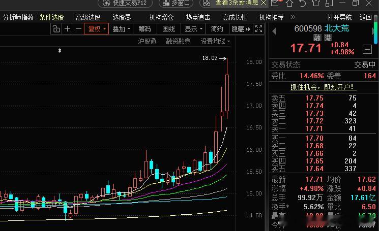 这一天终于来了,为了规避风险,我在15.6元把北大荒卖了结果,他奶奶的,北大荒没跌,涨到了17.6元,最近火气有点大,这个年过不好了,损失惨重