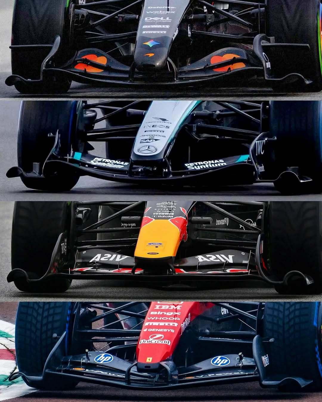 迈凯轮 vs 梅赛德斯 vs 法拉利 vs 红牛前翼和扩散器对比。目前应该都是偏