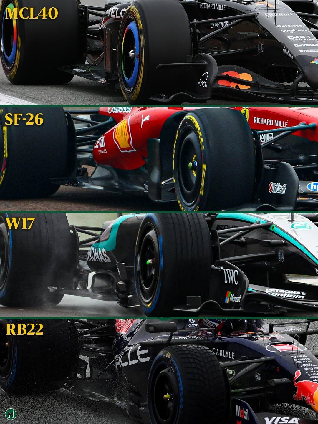 迈凯轮 vs 梅赛德斯 vs 法拉利 vs 红牛前翼和扩散器对比。目前应该都是偏基础的版本。2026f1