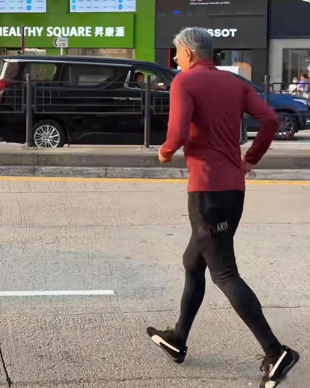 70岁周润发现身香港街头,他穿着红色运动衫下配黑色修身裤,一头白发梳得一丝不苟,身板挺直,身材很高挑,一路小跑身姿矫健,虽满头银发,即使面容苍老憔悴,依然霸气精气神十足,状态远超同龄人。