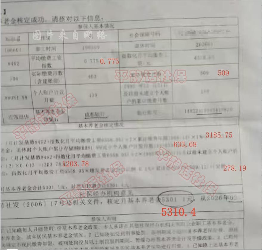 一张超级模糊的四川养老金核定表! 为了方便看信息,把数据还原一下,红字是我标注数字。 男性,四川成都退休,2026年1月60岁时退休,累计缴费509个月,折算成年是42年5个月,个人账户本息合计88081.99元,指数0.775。 基础养老金3185.75元、个人账户养老金633.68元、过渡性养老金1203.78元、独子补贴278.19元。 四项合计5301.40元,从2026年2月开始领取。 四川省独子补贴一项的计算公式是指数化工资*缴费年限*0.1%。 表格中这项叫做月增发养老金,不仅仅是独子补贴,还有其他性质的补贴都在这项反应。只不过绝大多数人能享受到的,只有独子补贴这一项。 对于各项奖励项目来说,四川省养老金属于项目较多的省份,很多省份在计算时养老金时,除了必须项,是没有任何其他数据的。