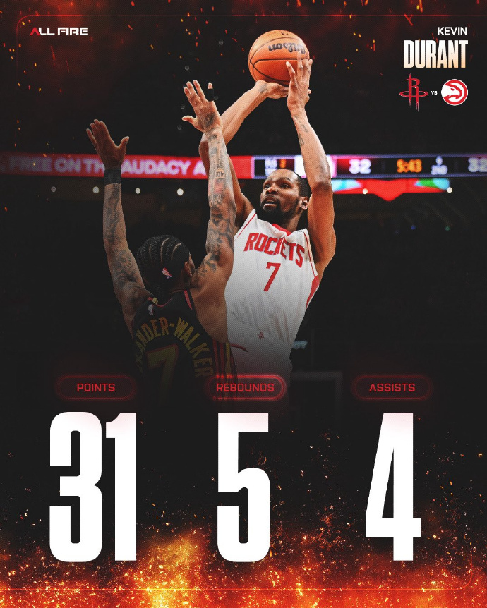 满分卡皇!#火箭终结老鹰四连胜# 两队都是背靠背的第二场, 都不约而同地有球员轮休, 但显然老鹰受到的影响更大, 当下半场火箭的三分找到准星, 当第四节卡皇开始吃饼, 比赛瞬间失去了悬念! 4投4中, 拿下10分7篮板2盖帽0失误的卡佩拉, 成为了火箭最大的X因素。 在熟悉的场地上, 打出了久违的畅快, 这对刚刚失去亚当斯的火箭来说, 绝对是一个好消息, 也不是无人可用, 关键是乌度卡你会不会用! 防守依旧是火箭的基本盘, 少了亚当斯, 只是少了篮板上的绝对优势, 想要弥补劣势, 也只能靠外线的手感了, 好在奥科吉、谢泼德、杜兰特都投进了3个三分球, 让比赛瞬间变得简单! 小杜又打了34分半, 37岁的人了, 背靠背还要这么卖力, 看着就累啊! 乌度卡也是真狠, 第四节领先10多分了, 还要叫杜兰特出来收比赛, 小杜这工资拿得不容易啊, 跑了几个回合, 实在看不下去, 直接一记三分, 终结悬念打卡下班! 交易截止日就在眼前, 字母哥的交易留言飞起, 火箭还会补中锋吗?
