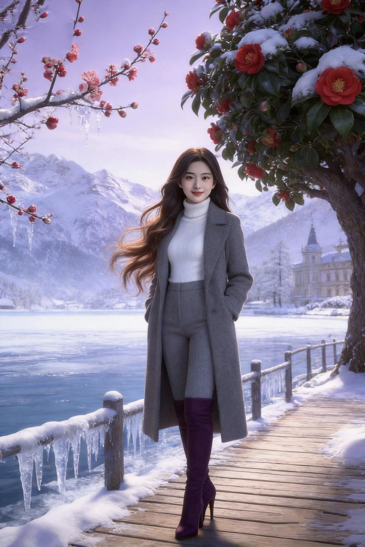 《雪岸山茶》 冰棱垂在木栏的檐角 雪粒凝在山茶的红袍 她踏过霜色的栈道 灰衣漫过冬的寂寥 白衫是雪堆里的光 紫靴叩响木板的轻响 远山在雾里沉睡 古堡尖顶挑着薄阳 梅枝斜斜探出冰挂 风梳过波浪似的长发 她的笑比山茶更暖 融化了一路的霜花 赏析:这首诗以冬日湖畔的场景为底色,用“冰棱”“雪粒”“霜色栈道”等意象构建出清冷静谧的冬日氛围,再以“山茶”“白衫”“紫靴”的鲜明色彩打破沉寂,让画面在冷调中透出鲜活的暖意。 诗中“紫靴叩响木板的轻响”一句,用听觉细节让静态画面流动起来,而“她的笑比山茶更暖”则将人物的温柔与自然的盛放融为一体,既呼应了图中少女的明媚神态,也让冬日的清冷多了一份治愈感。 梅雪之诗 梅雪诗意 盛开霜雪 雪冷诗人 冬红山茶 咉雪诗词 冰雪山茶