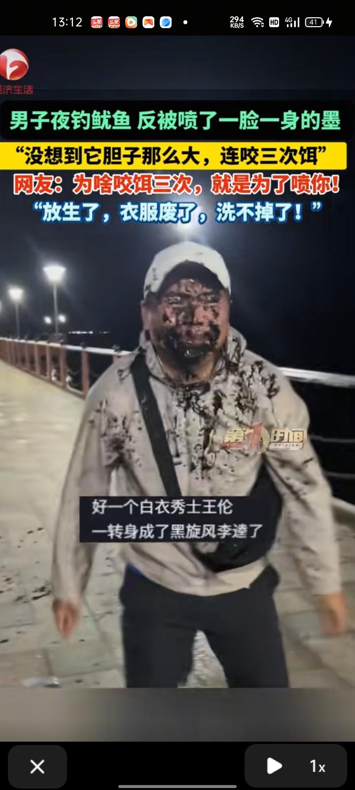 1月27日,海南海口。男子去桥上甩两杆打发时间,第一杆就钓到了鱿鱼,鱿鱼对他喷了墨跑了,第二次鱿鱼咬钩后又跑了,第三次鱿鱼咬了饵,又对他喷了一脸墨。最后放生了,墨汁洗不掉