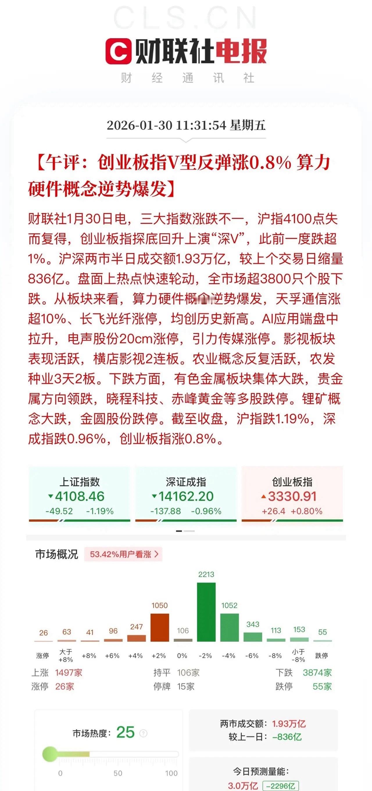 午评,盘面没有任何问题!有色金属跌那是因为人家涨的多,和我们没有什么关系,总不能大涨没有你下跌必有你吧!涨跌停比26:55,创业板涨幅直逼1%,通信设备中际旭创、新易盛权重股撑盘。光纤走涨价行情:中天科技、亨通光电、长飞光纤上涨加速!生益电子四季报披露泄气、回头看胜宏科技大哥还是大哥,市场现在追踪一季度谷歌、英伟达订单!机器人终于调整到位了,盘中江苏雷利等有止跌动作。记住现在是牛市啊,主线调整到位你认为是机会就大胆上车。电池股也是一个逻辑…春节消费股行情有望进一步扩大,CPI提升是2026年重点工作,消费股一旦走涨价行情,骚起来根本没有其他板块什么事!…