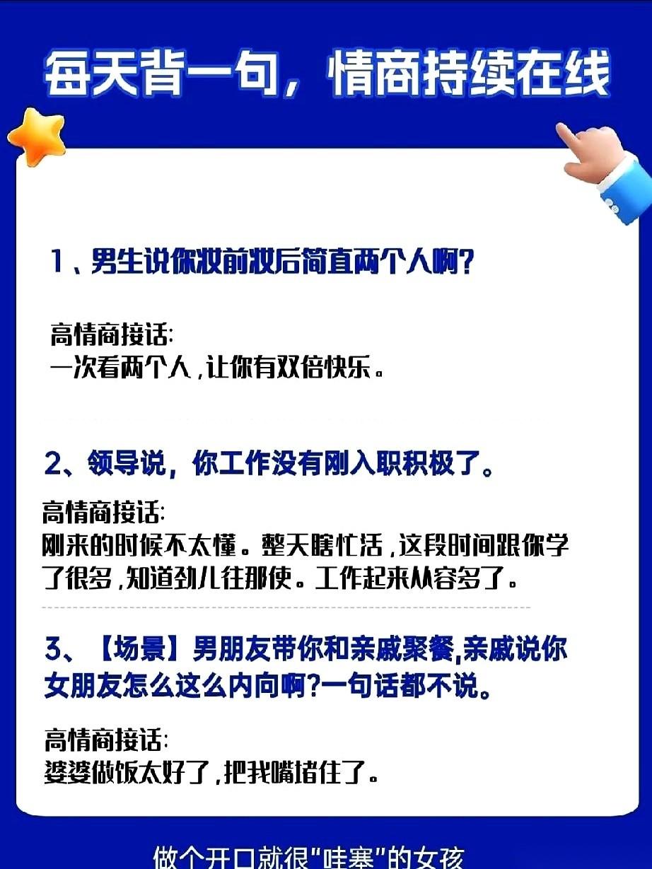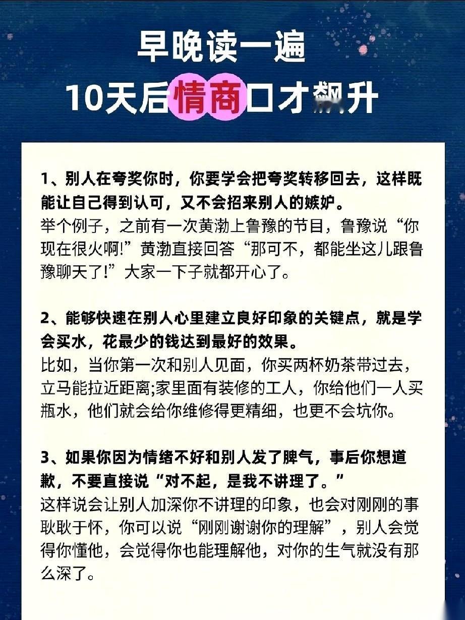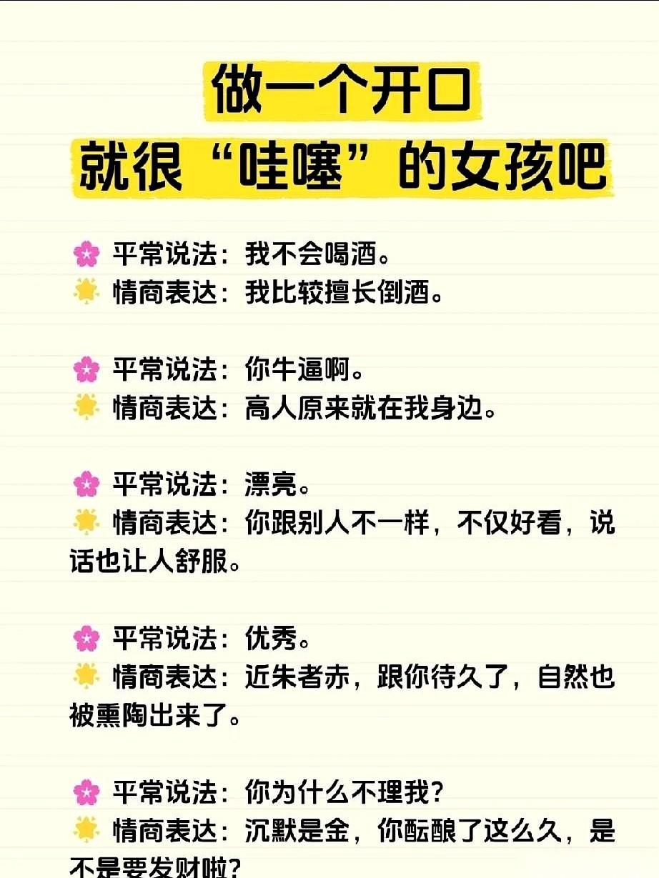 求求了,别再收藏那些“高情商话术”了。 真的。 我见过最不会聊天的人,就是那种把沟通当公式,对着人背诵模板的。眼睛里一点光都没有,全是技巧,全是盘算。 你听着都累,感觉像在跟一个披着人皮的AI对戏。 大家都是出来混口饭吃的,能不能真诚点,别互相演了。 很多人都搞反了。 以为会说话,是嘴皮子利索,是滴水不漏,是永远能接住所有的话。 错了。 真正的沟通高手,你看他好像没说什么,但你就觉得舒服,觉得被看见了。 为什么? 因为人家根本没琢磨“我该怎么说”,人家在想“你到底想说什么”。 人家的全部注意力,都在你身上。发自内心地好奇你这个人,关心你此刻的感受,在乎你真正在意的东西。 把“我”字从脑子里请出去一会儿。 去听。 去感受。 当你真正开始关心“对方”而不是“自己的表现”时,你说的每一句话,自然就带着温度,带着真诚。 那玩意儿,比任何话术都高级一百倍。 说白了,最高的“情商”,不是表演出来的,是真心换真心。