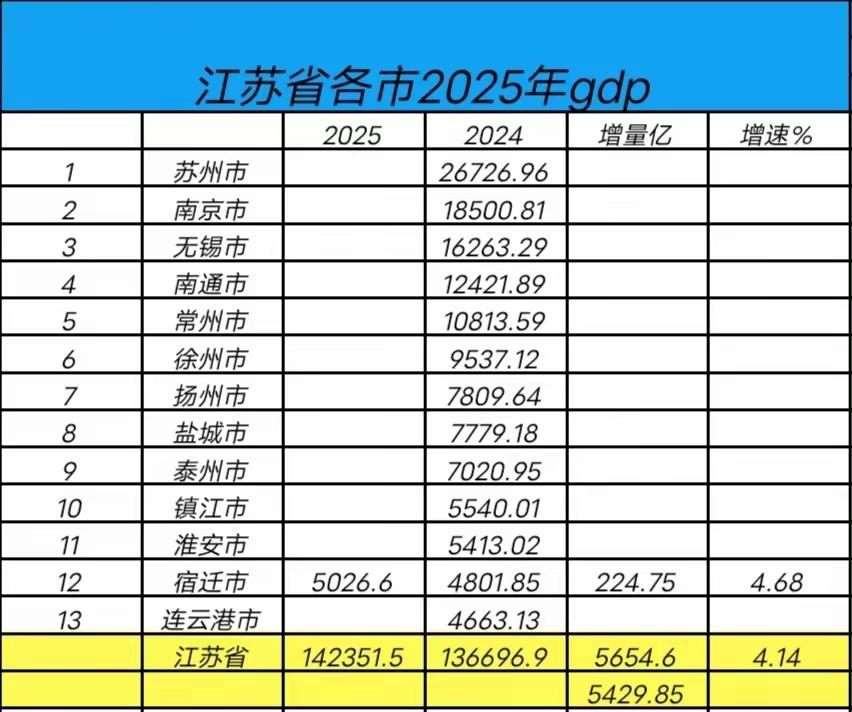 江苏城市gdp记录我的2026 老徐口中的万亿城市至今尚未官宣,想欢庆无语。目前13个市中,仅宿迁公布了GDP数据,达到5026亿,成功突破5000亿大关。南京的经济数据也已出炉,2025年全年GDP达19428亿,距离2万亿仅差500多亿。 从全省来看,大概率就只剩连云港一个市GDP未破五千亿了。不过,这也没什么可尴尬的。连云港在江苏排名末尾,但若放在其他大多数省份,其GDP排名会相当靠前。 南京 宿迁