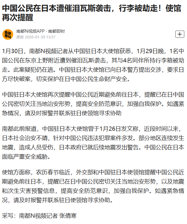 【#中国公民在日本遭催泪瓦斯袭击#,行李被劫走!使馆再次提醒】1月30日,南都N