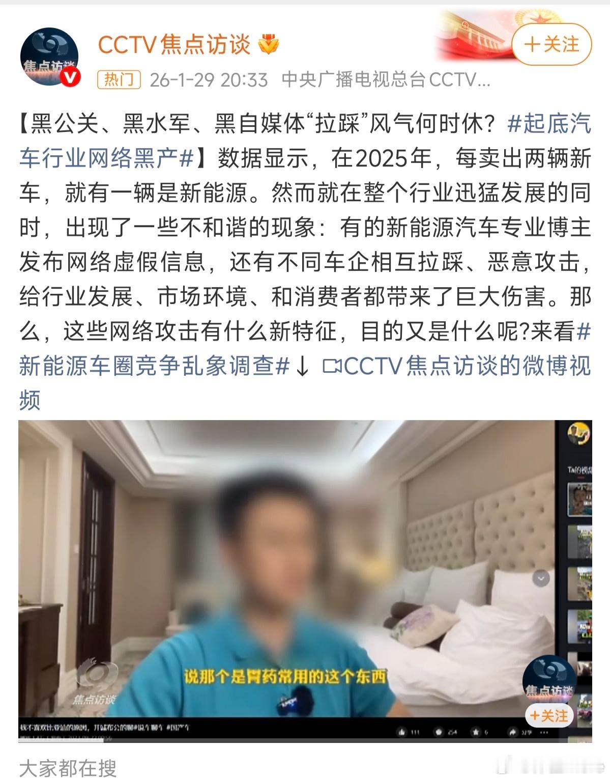 起底汽车行业网络黑产昨晚央视《焦点访谈》起底了新能源汽车行业遇到的网络黑产问题,出于恶性竞争的目的,车企间相互拉踩恶意攻击,还有一些博主为了流量和钱财虚假宣传虚假测评。