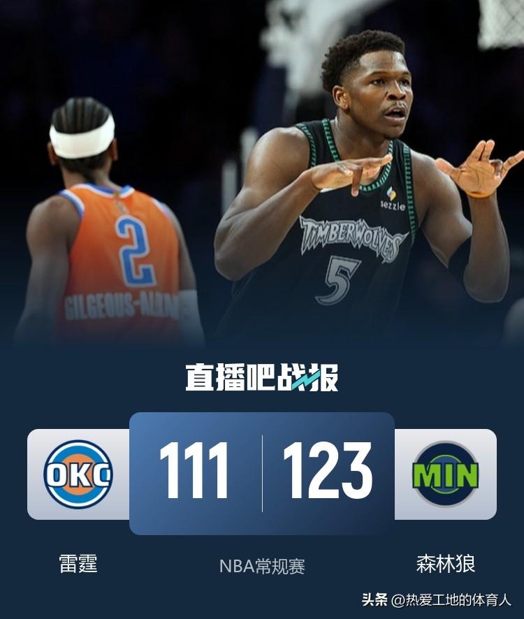新任狼王对决上赛季MVP 森林狼主场123:111击退雷霆迎来三连胜,雷霆也尝到了赛季第11败,狼王爱德华兹表现出色拿到了26+5+5的数据,麦丹砍下21+4+4,森林狼6人得分上双主场力克雷霆;雷霆这边亚历山大空砍30分(连续119场得分20+),雷霆首节就被森林狼打的毫无还手之力,最终客场遗憾落败,恭喜森林狼取得本场比赛胜利!爱德华兹森林狼 狼王爱德华兹 森林狼篮球