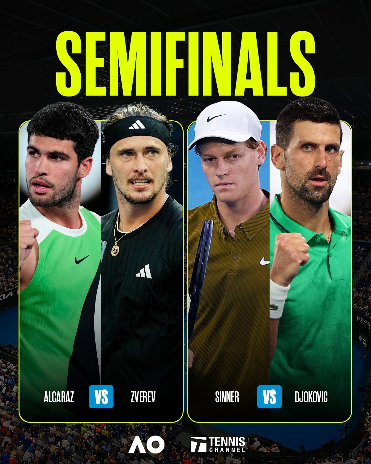 半决赛马上开打了2026澳网阿尔卡拉斯vs兹维列夫德约科维奇vs辛纳