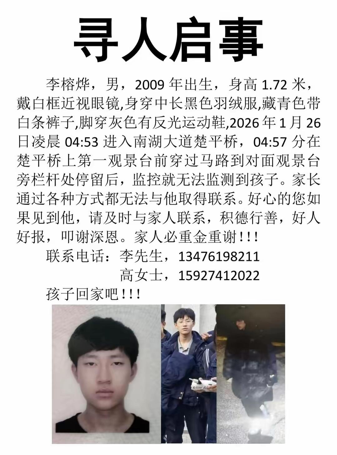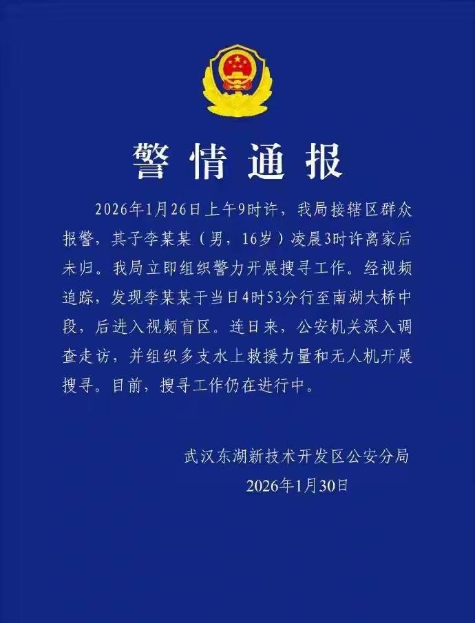 揪心!16岁少年离家多日仍未寻获。孩子到底去哪了?近日,武汉16岁少年李榕烨离家后失联,引发关注。1月30日上午,其父亲李先生称,他们在1月26日孩子失联当天便已报警,截至目前仍未找到。今天,当地警方发布通报称,目前搜寻工作仍在进行中。希望有知情者提供线索,让孩子早日回家。社会热点 武汉一16岁少年离家出走 16岁少年离家出走超4天音信皆无