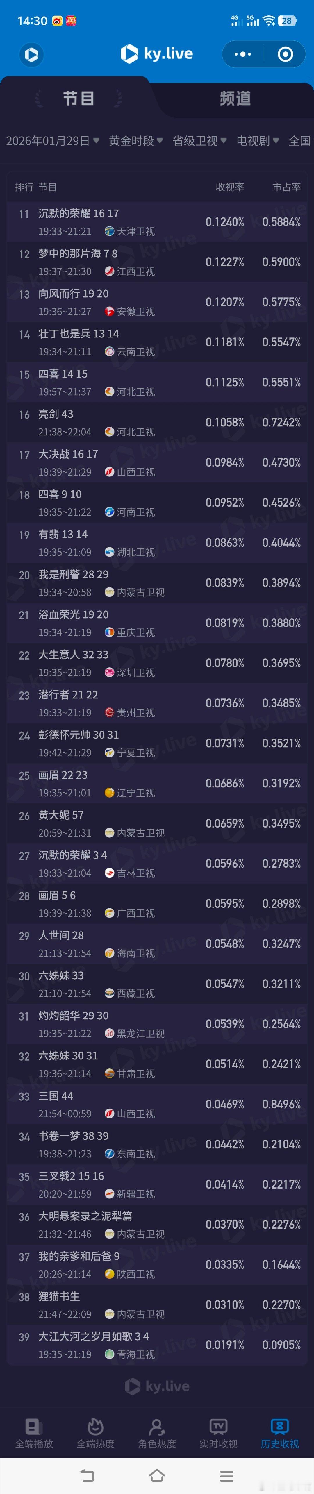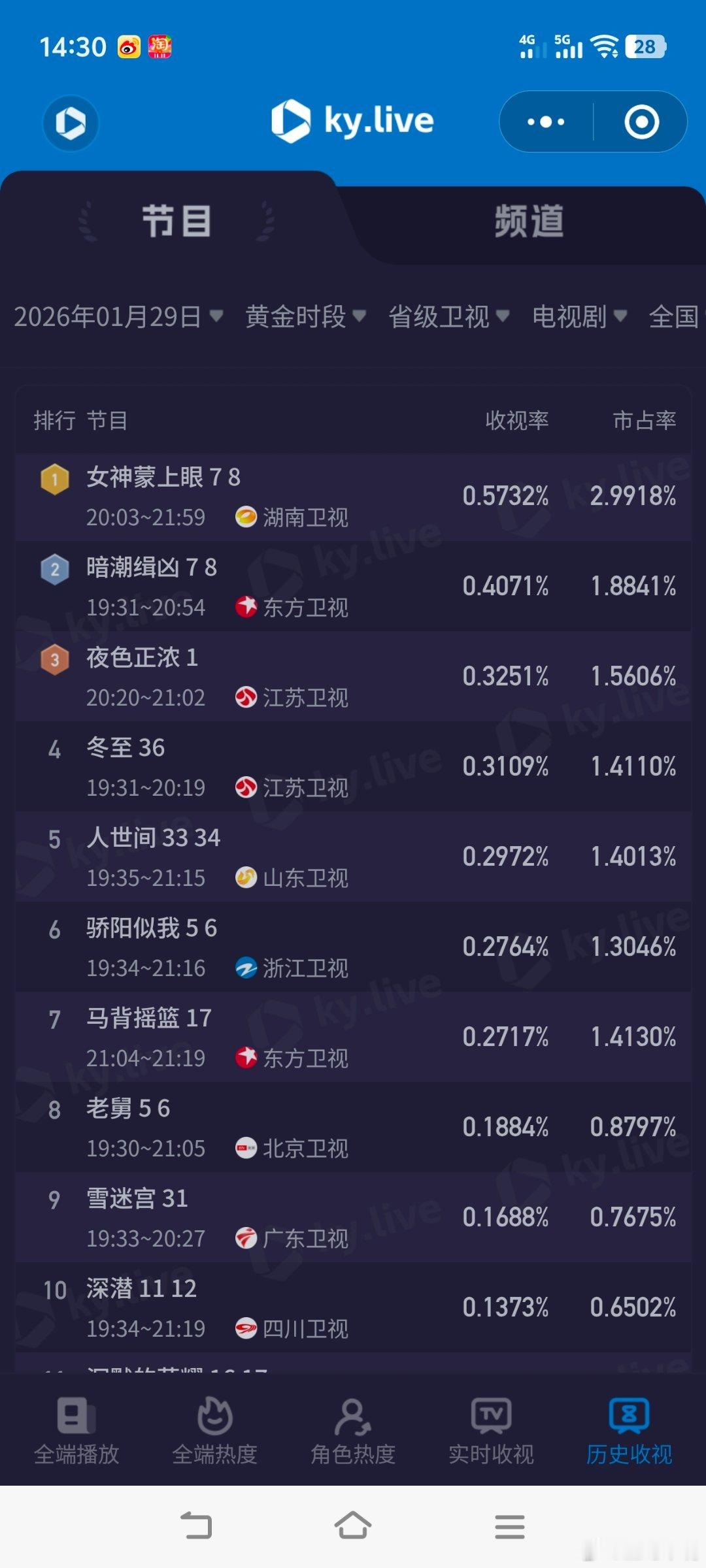 央一《太平年》2.801,湖南《女神蒙上眼》0.425新高东方《暗潮缉凶》 0.455江苏《夜色正浓》首播0.261
