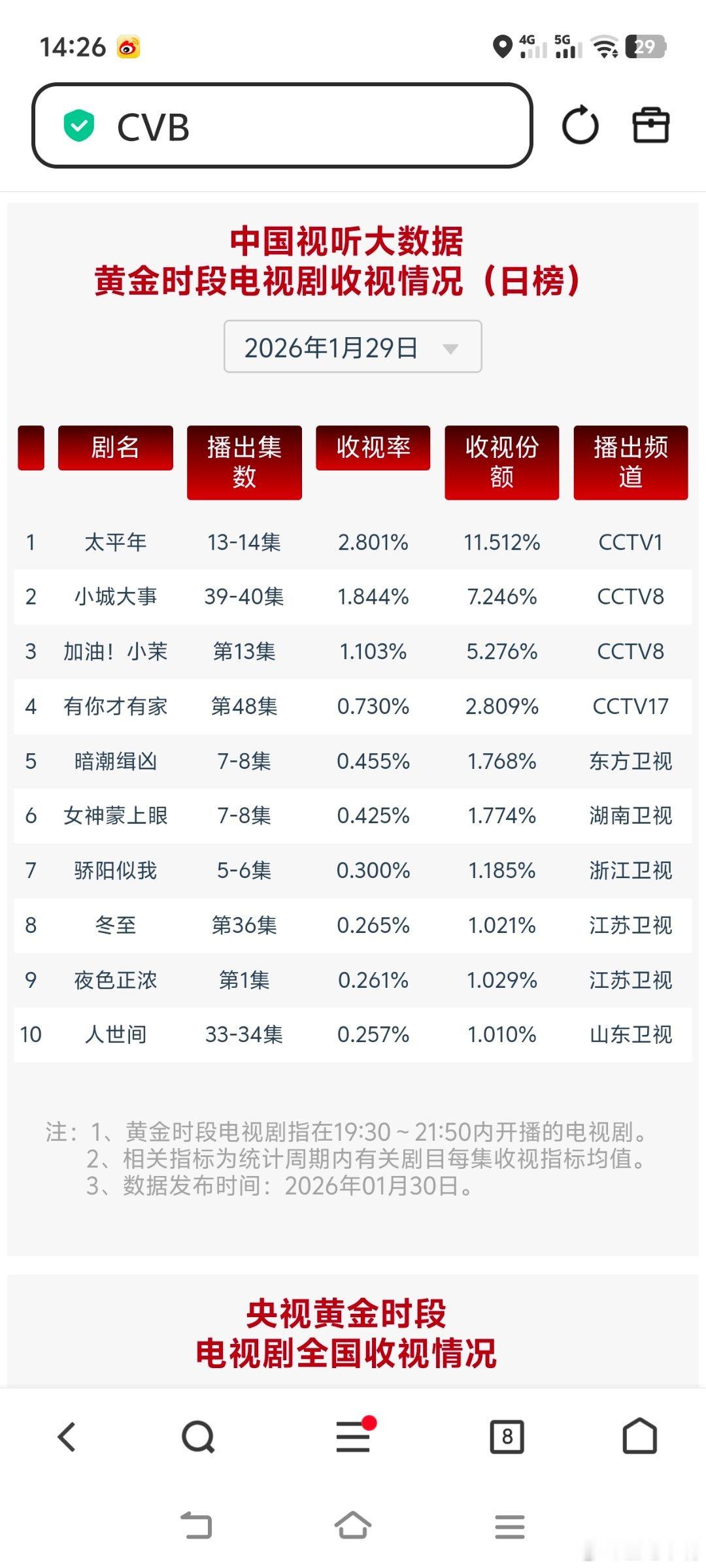 小城大事央八收官1月29日cvb收视日报!赵丽颖《小城大事》全集cvb集均1.7