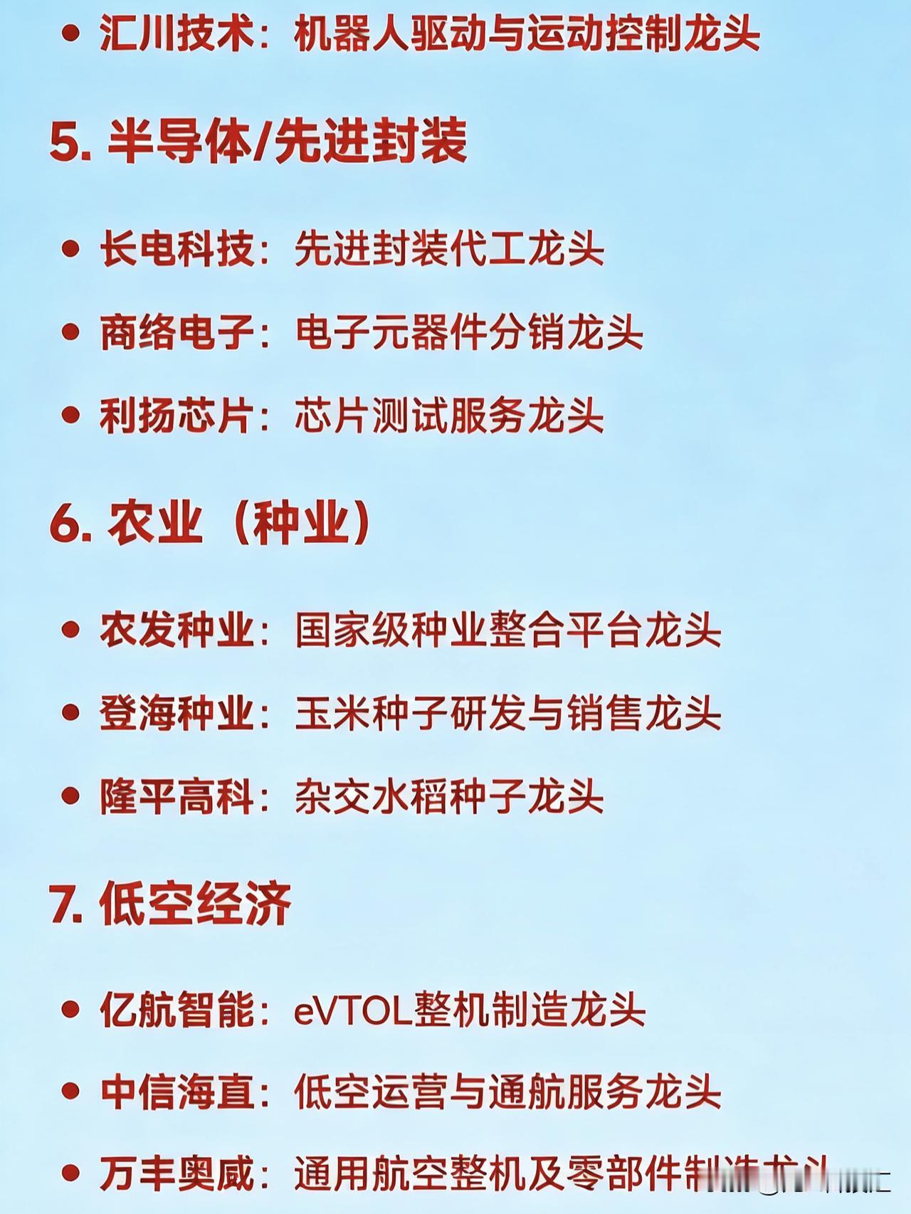 2026年1月30日十大热点概念核心企业 1. 贵金属(黄金/白银/铜) 紫金矿业:黄金与铜资源双龙头 白银有色:白银冶炼与资源龙头 中国黄金:黄金珠宝零售龙头 洛阳钼业:全球铜钴资源龙头 2. AI应用(营销/内容/出海) 因赛集团:AI营销应用龙头 蓝色光标:AI+数字营销出海龙头 科大讯飞:端侧大模型与AI终端方案龙头 浙文互联:AI内容生成与营销服务龙头 3. 商业航天 中国卫星:低轨卫星制造与星座组网龙头 航天宏图:遥感卫星数据应用龙头 航天电子:星载设备与航天电子系统龙头 天银机电:卫星姿控核心部件供应商龙头 4. 人形机器人 拓斯达:人形机器人本体集成龙头 鸣志电器:机器人伺服电机与控制系统龙头 绿的谐波:机器人精密减速器龙头 汇川技术:机器人驱动与运动控制龙头 5. 半导体/先进封装 长电科技:先进封装代工龙头 商络电子:电子元器件分销龙头 利扬芯片:芯片测试服务龙头 6. 农业(种业) 农发种业:国家级种业整合平台龙头 登海种业:玉米种子研发与销售龙头 隆平高科:杂交水稻种子龙头 7. 低空经济 亿航智能:eVTOL整机制造龙头 中信海直:低空运营与通航服务龙头 万丰奥威:通用航空整机及零部件制造龙头 8. 固态电池 赣锋锂业:固态电池材料与电芯研发龙头 清陶能源:半固态/全固态电池量产应用龙头 上汽集团:固态电池装车落地整车厂龙头 9. 影视/春节档消费 横店影视:春节档影片投资出品龙头 光线传媒:国产动画电影制作与发行龙头 10. 服务消费新增长点 中国中免:免税消费与入境消费服务龙头 爱婴室:母婴服务消费龙头 鱼跃医疗:家用医疗器械与健康服务龙头
