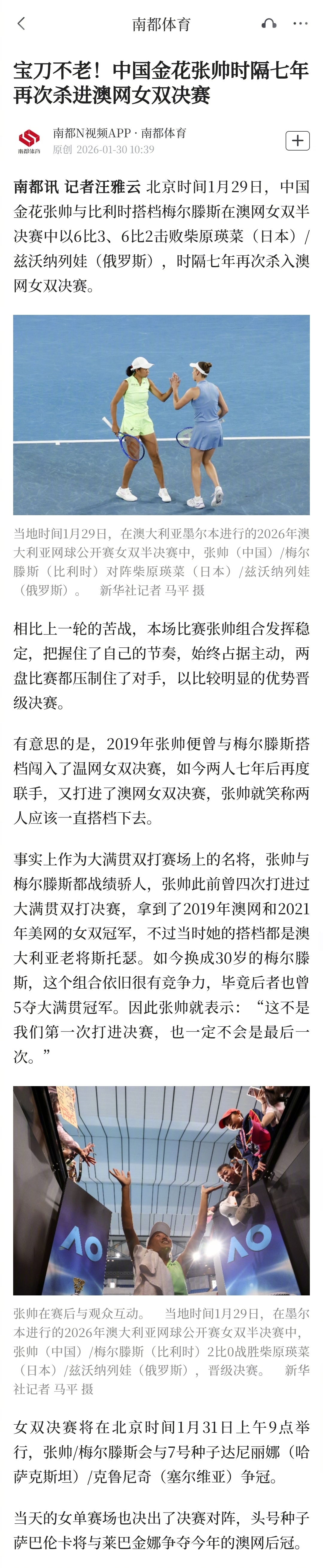 有意思的是,2019年张帅便曾与梅尔滕斯搭档闯入了温网女双决赛,如今两人七年后再度联手,又打进了澳网女双决赛,张帅就笑称两人应该一直搭档下去。