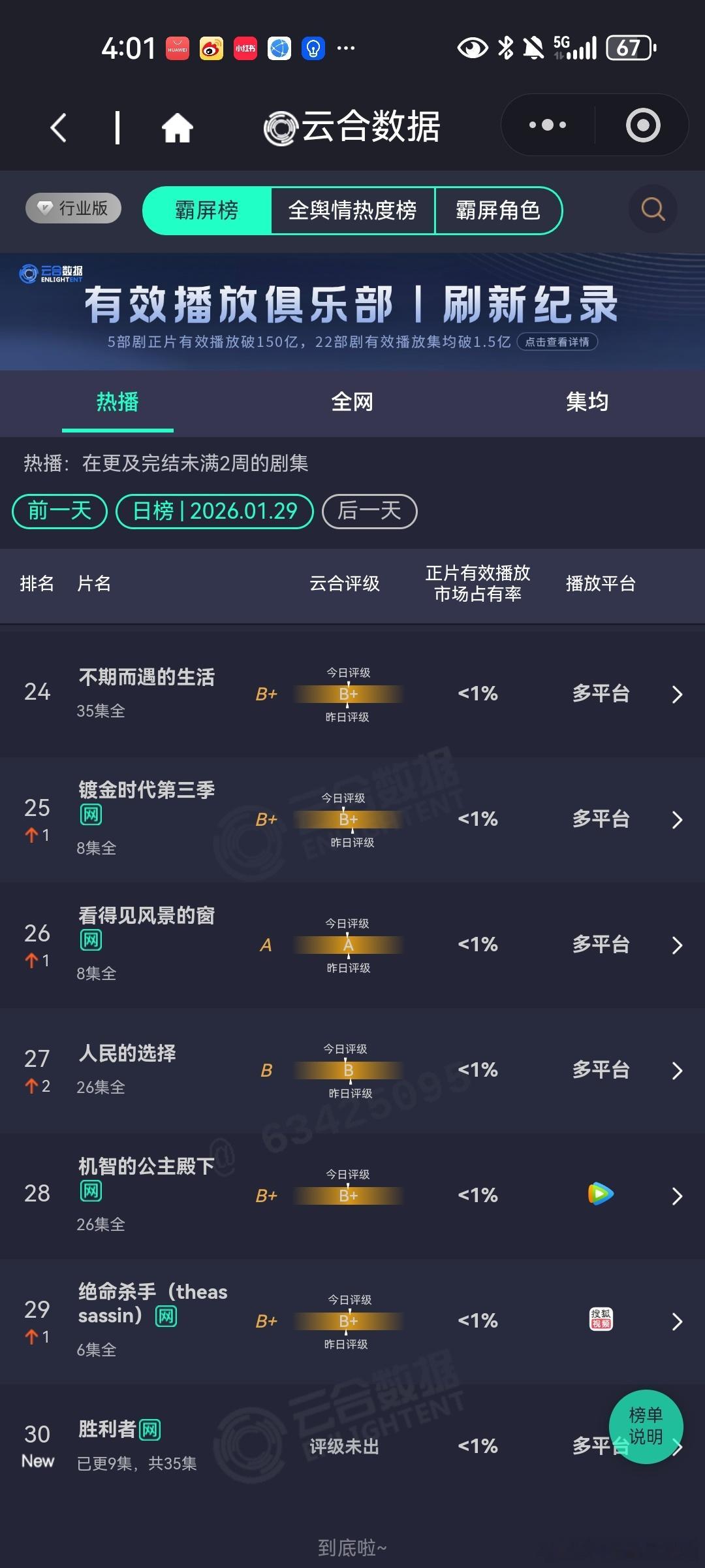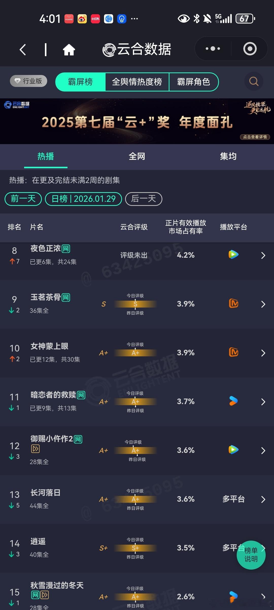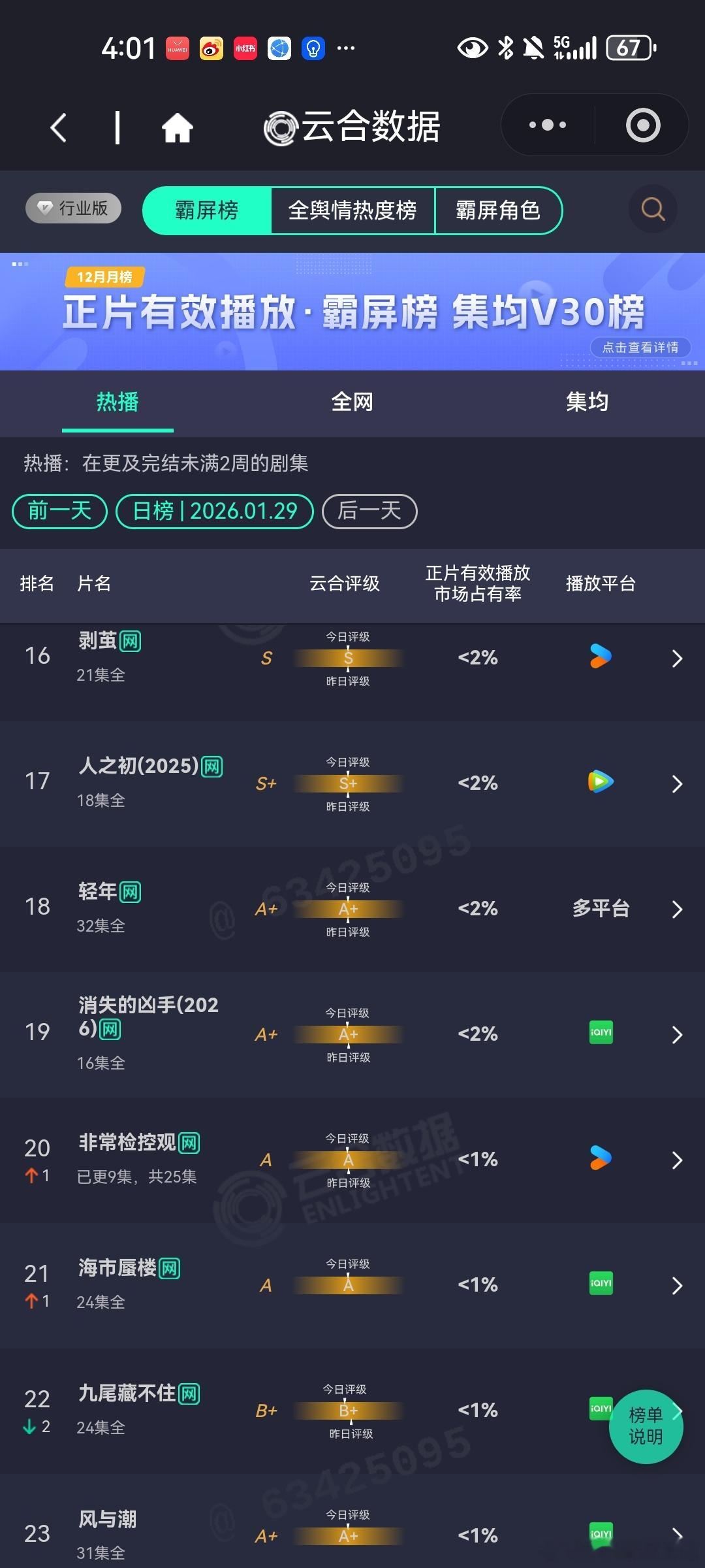 1月29日云合播放占比云合 太平年18.5评级大幅上升,越来越好了小城大事11.9%全程S,是真的扑啊有罪之身5.2%差一点点翻倍成功,总体还是不错的,毕竟没什么宣发。